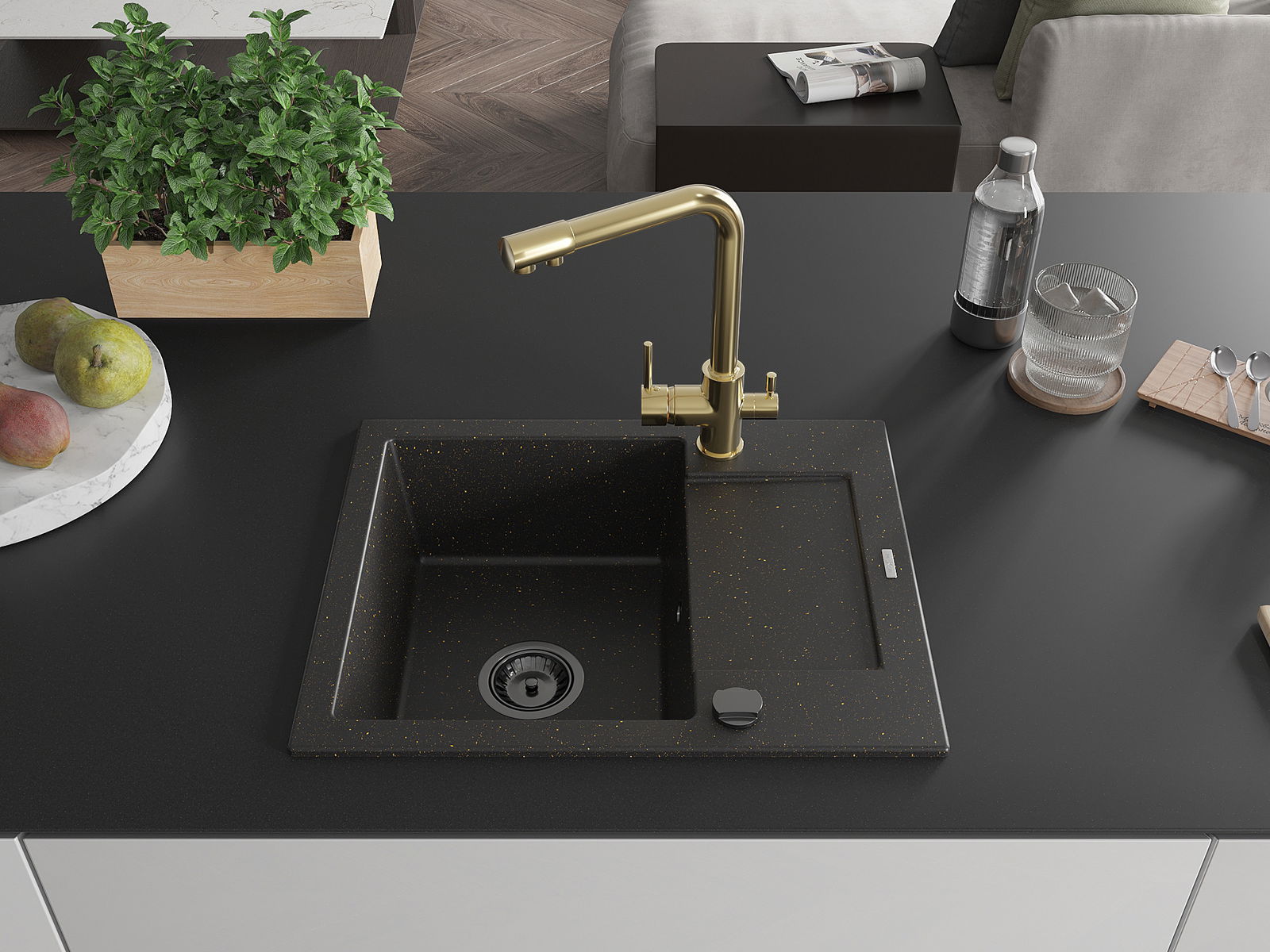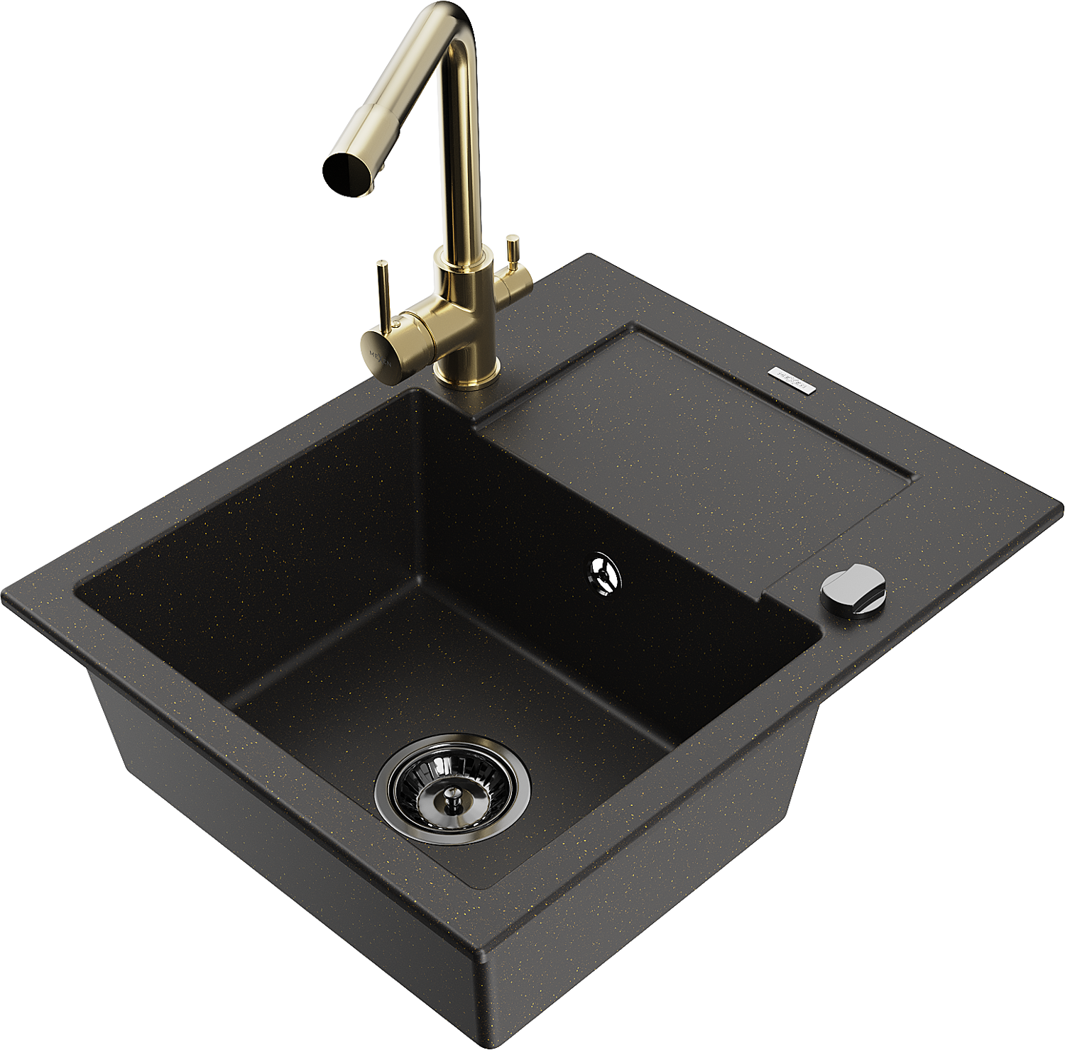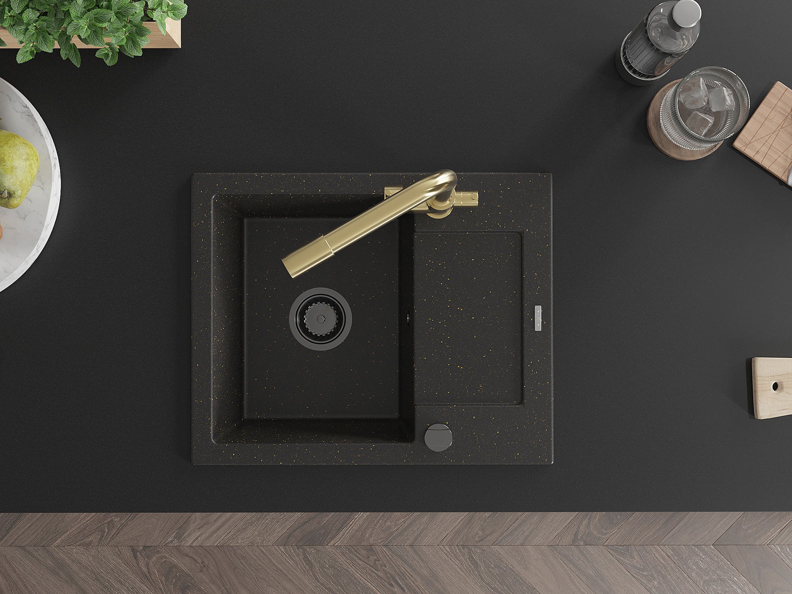 Mexen Enzo chiuvetă de granit 1-cameră cu scurgător și baterie de bucătărie Duero, negru/auriu metalic