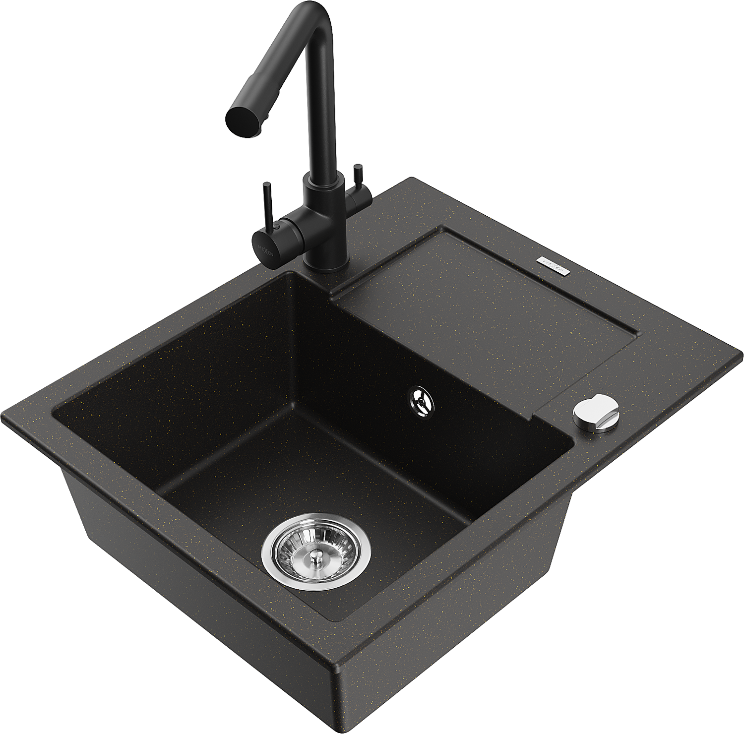 Mexen Enzo chiuvetă granit 1-vas cu scurgător și baterie de bucătărie Duero, negru/auriu metalic - 6506-75-671600-70