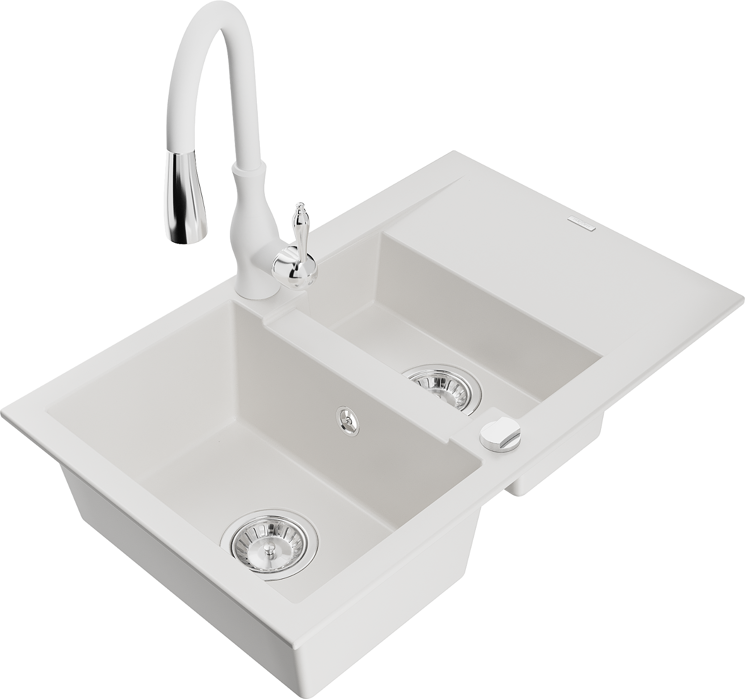 Mexen Gaspar chiuvetă din granit cu 1,5 cuve cu scurgător și baterie de bucătărie Savita, alb - 6507-20-672601-20