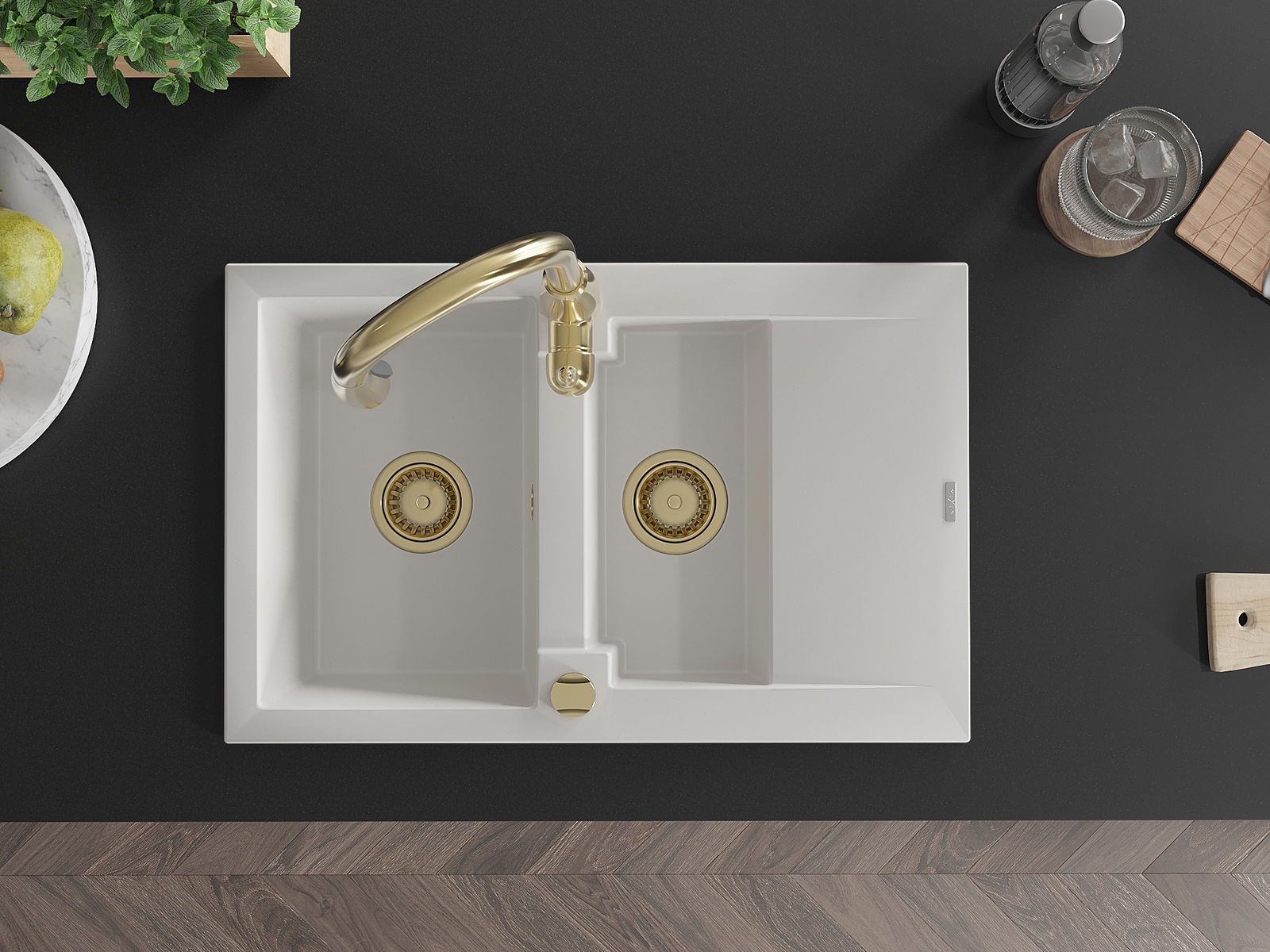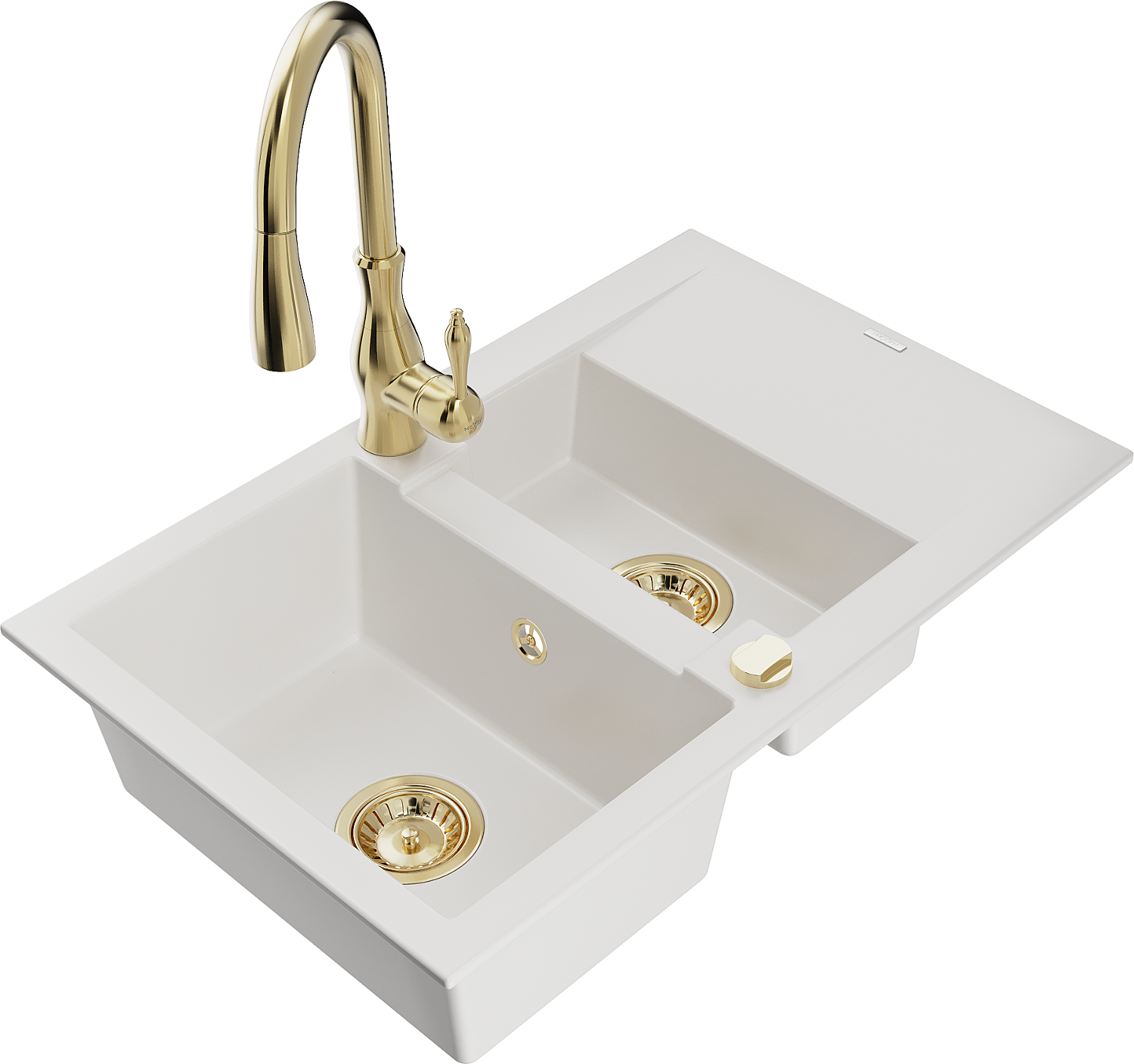 Mexen Gaspar chiuvetă granitică 1,5 camere cu scurgător și baterie de bucătărie Savita, alb - 6507-20-672601-50