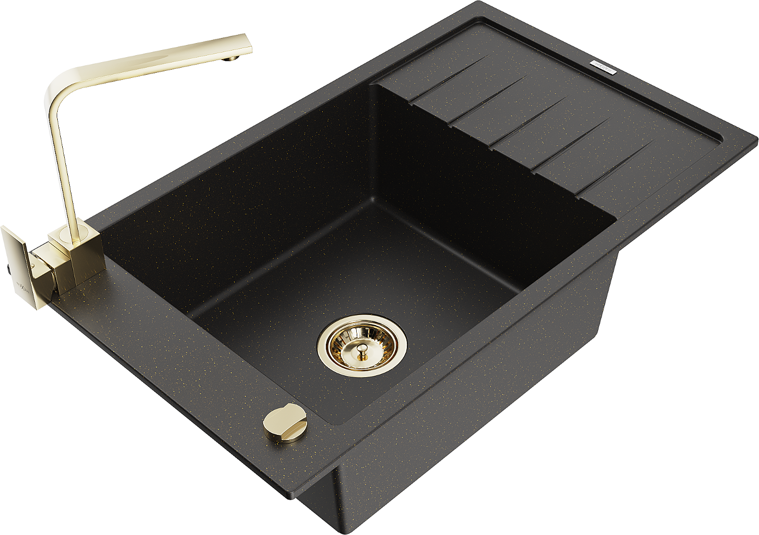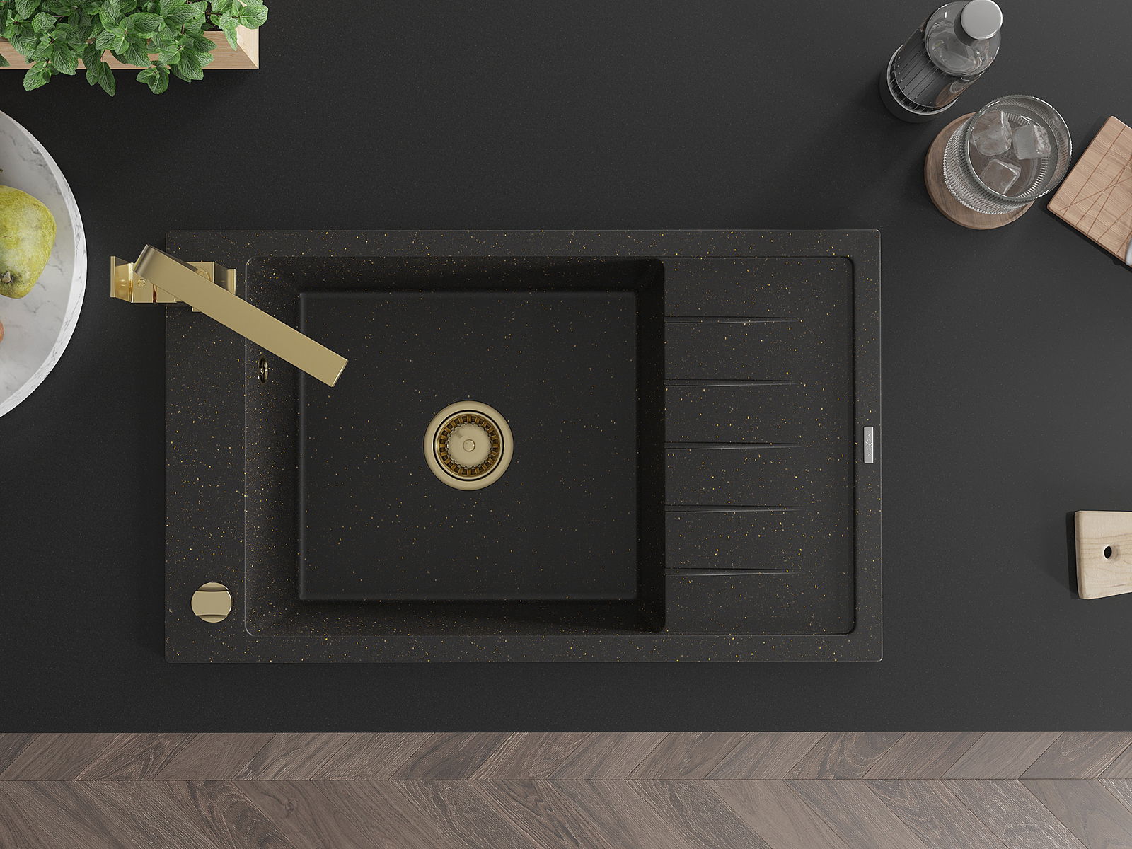 Mexen Elias chiuvetă de granit cu 1 compartiment, cu scurgător și baterie de bucătărie Rita, negru/auriu metalic