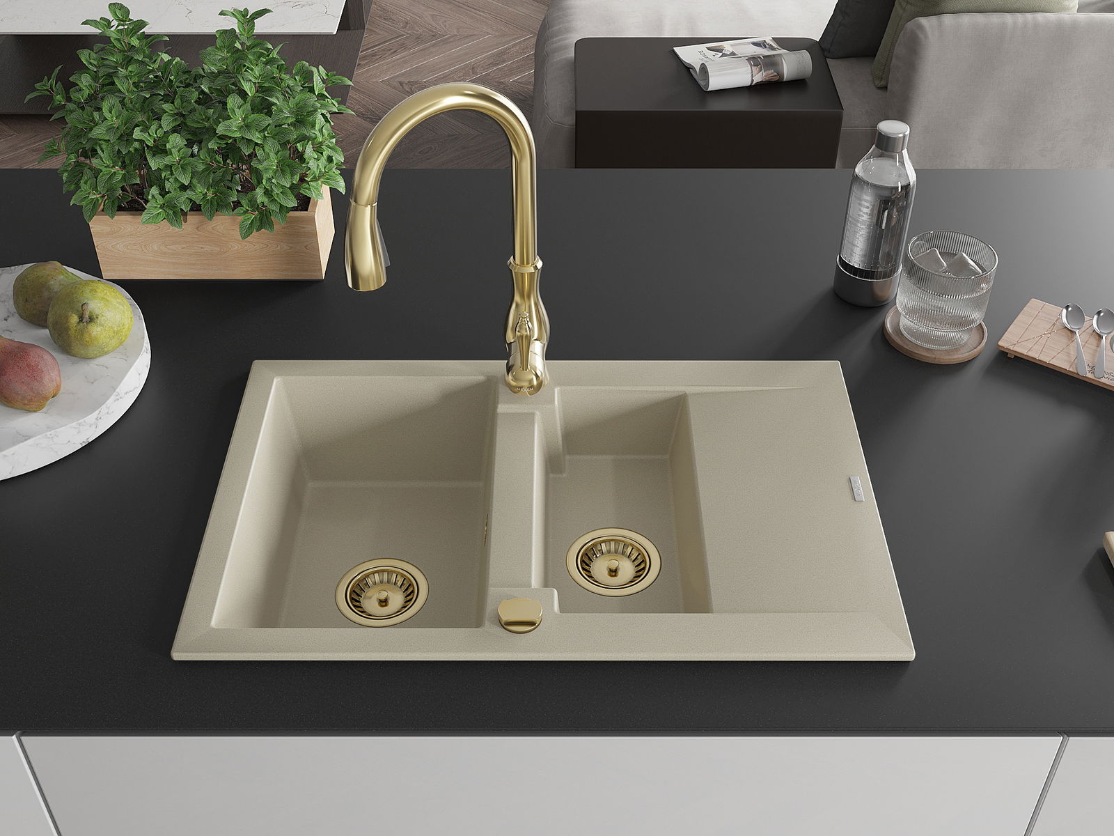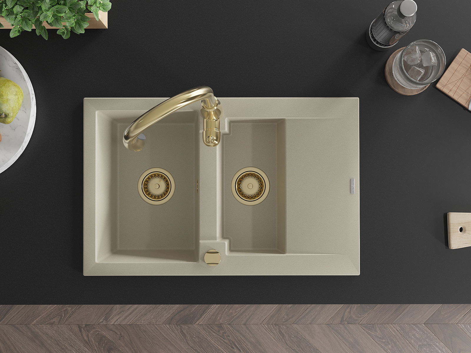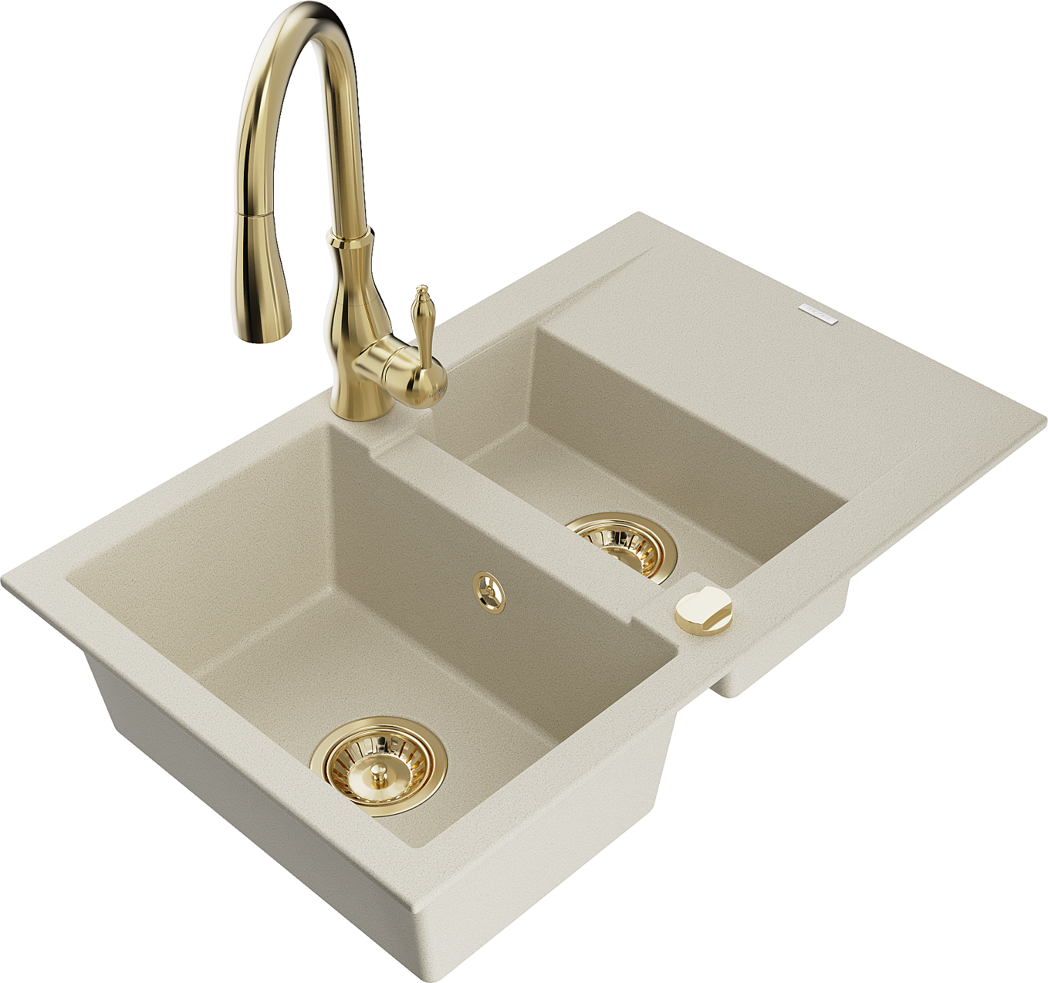 Mexen Gaspar chiuvetă din granit cu 1,5 compartimente cu scurgător și baterie de bucătărie Savita, bej - 6507-69-672601-50