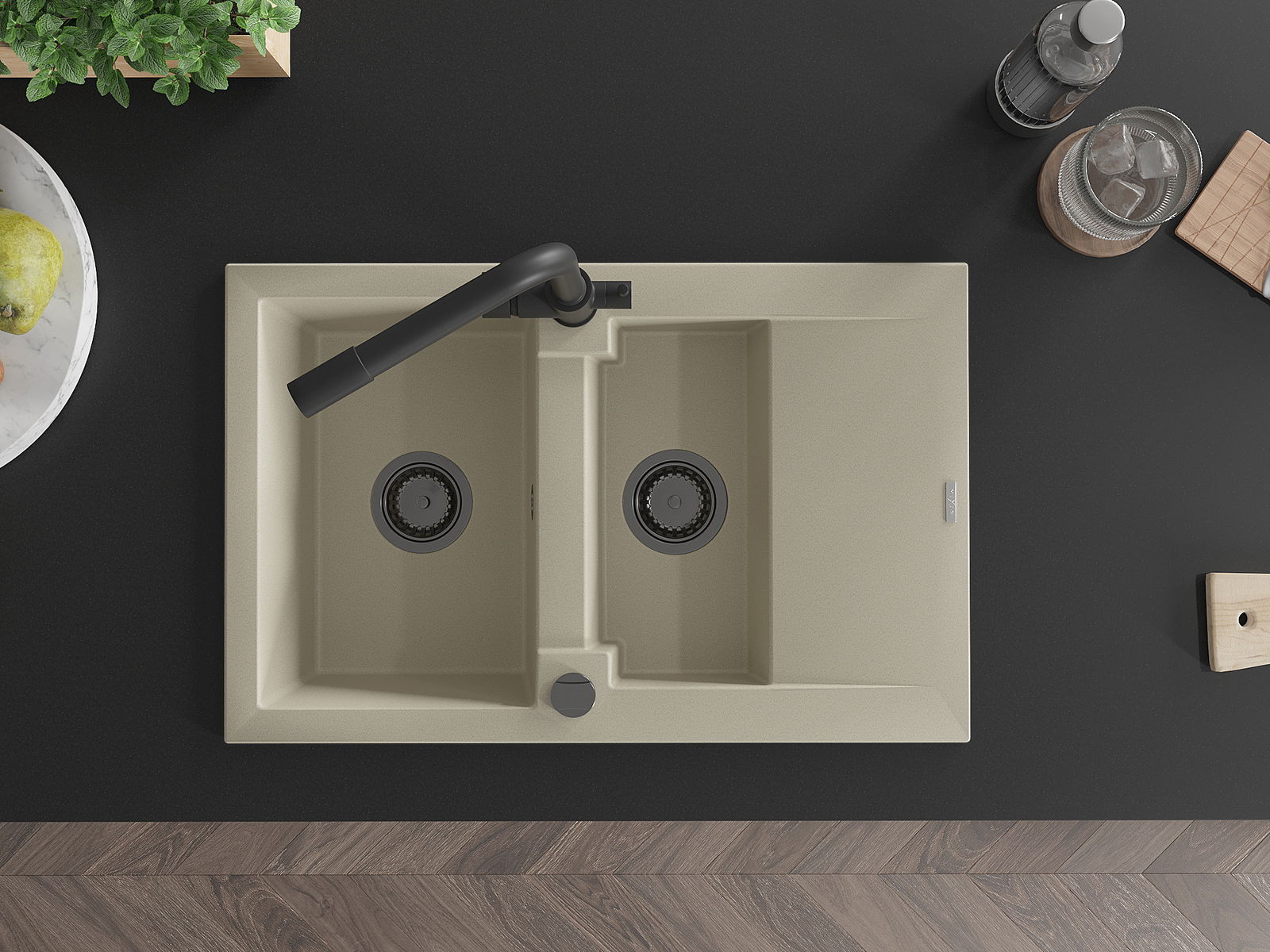 Mexen Gaspar chiuvetă din granit cu 1,5 cuve cu scurgător și baterie de bucătărie Duero, bej - 6507-69-671600-70