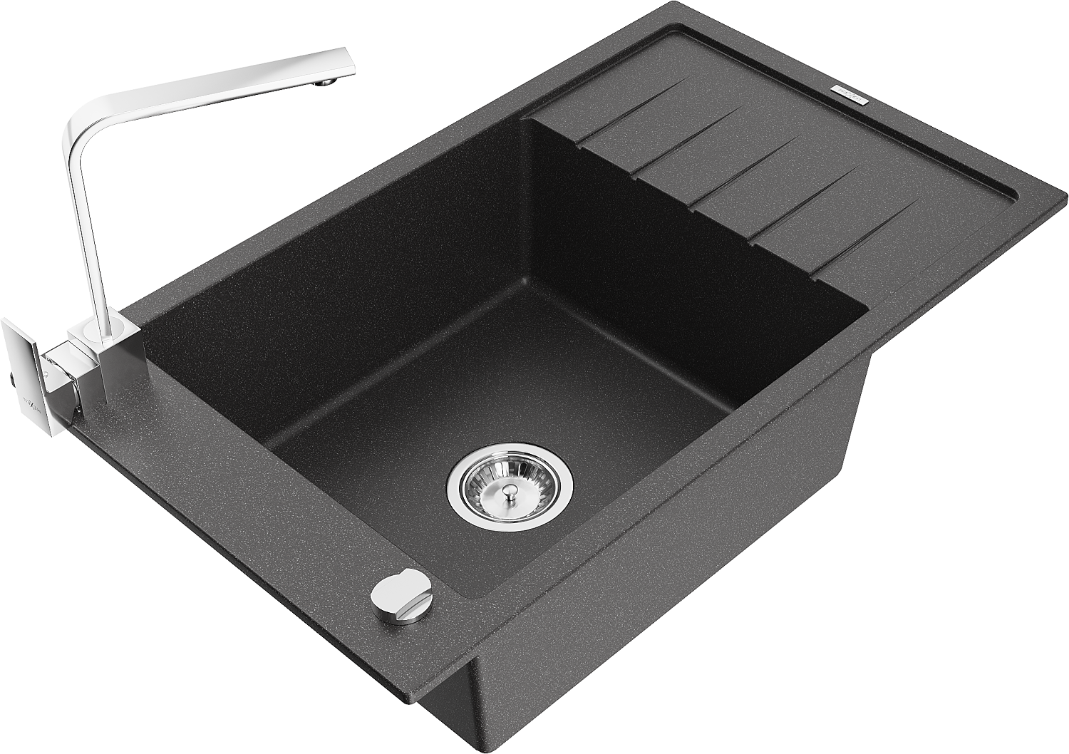 Mexen Elias chiuvetă din granit cu 1 compartiment cu picurător și baterie de bucătărie Rita, negru cu pete - 6511-76-670300-00