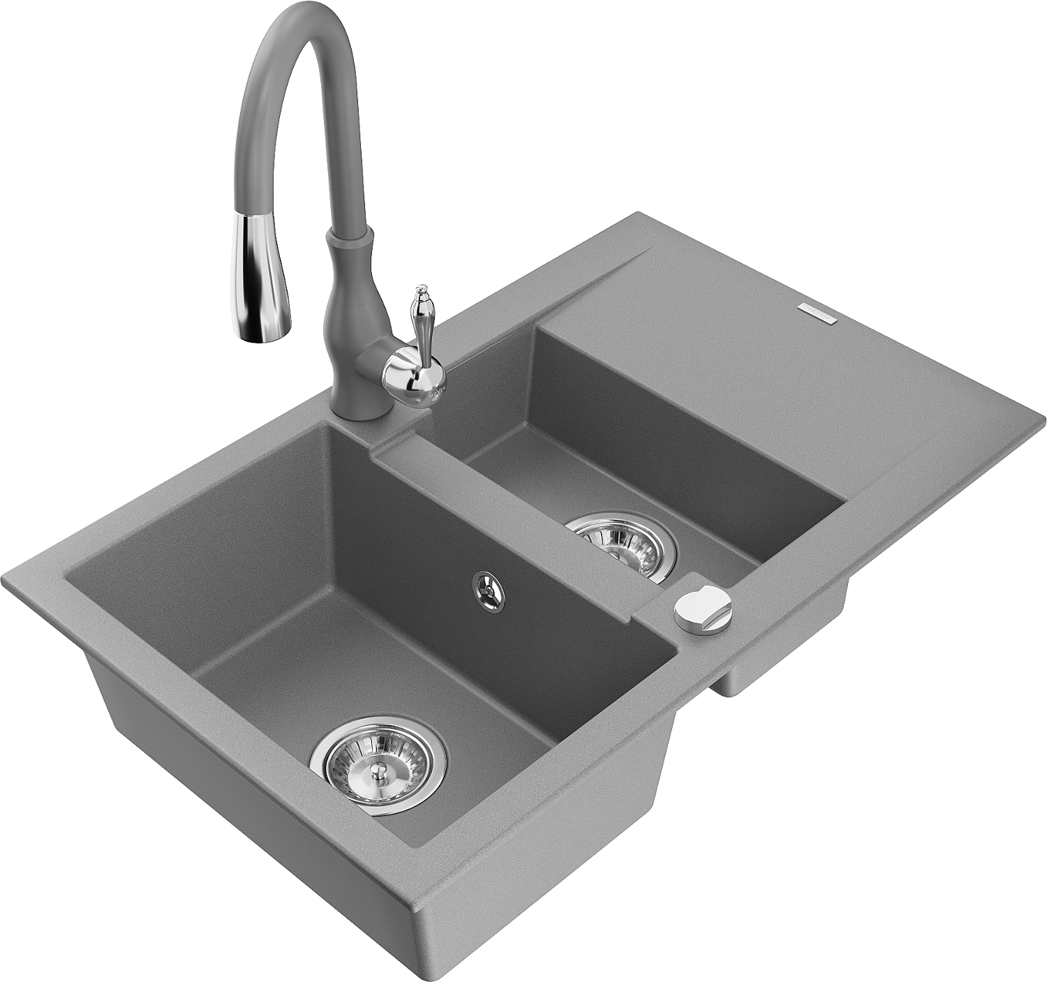 Mexen Gaspar chiuvetă de bucătărie granit 1,5-camere cu scurgător și baterie de bucătărie Savita, gri - 6507-71-672601-71