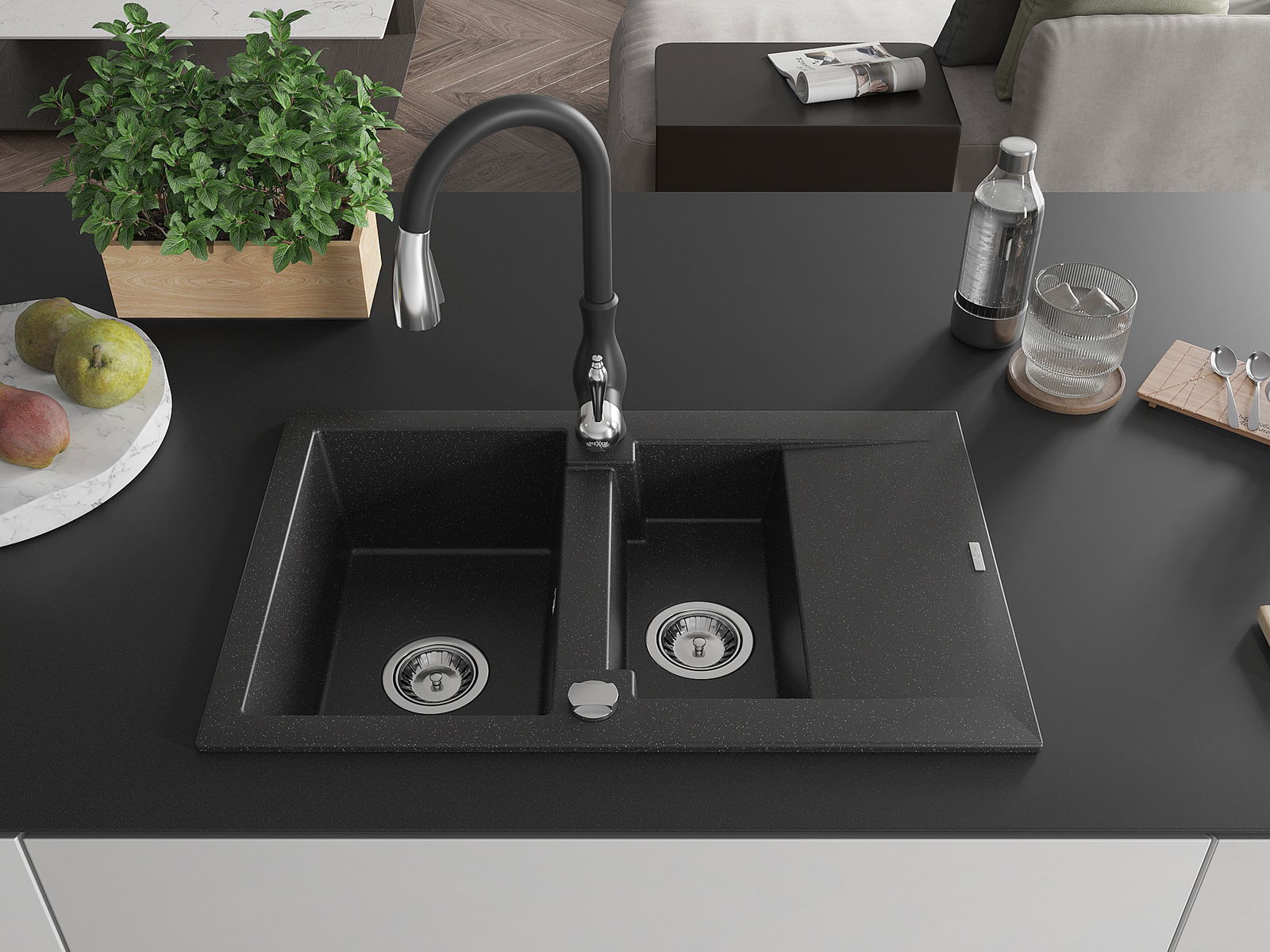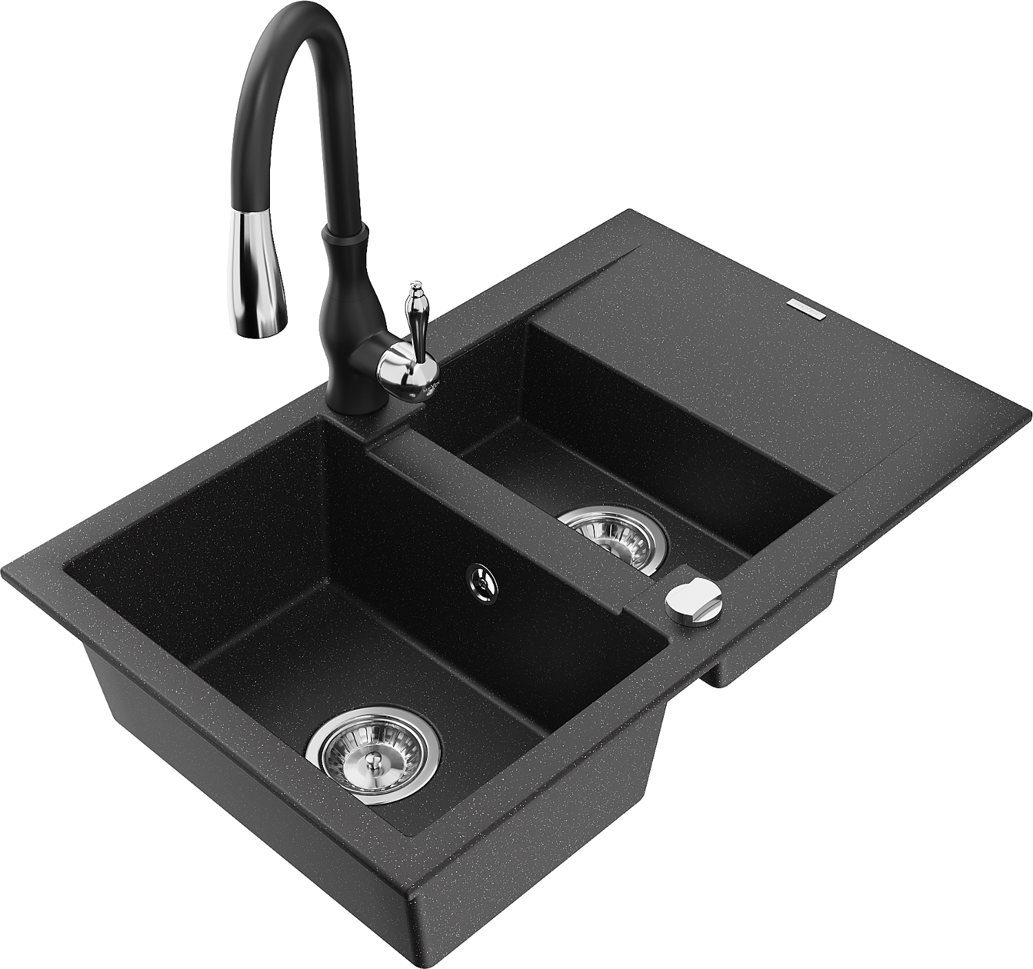 Mexen Gaspar chiuvetă din granit cu 1,5 cuve și scurgător și baterie de bucătărie Savita, negru/argintiu