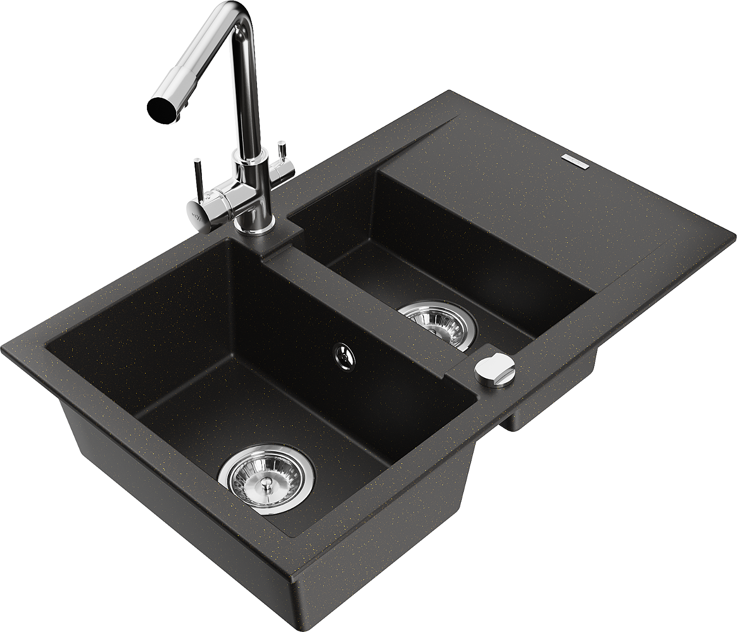 Mexen Gaspar chiuvetă de granit cu 1,5 camere cu scurgător și robinet de bucătărie Duero, negru/auriu metalizat