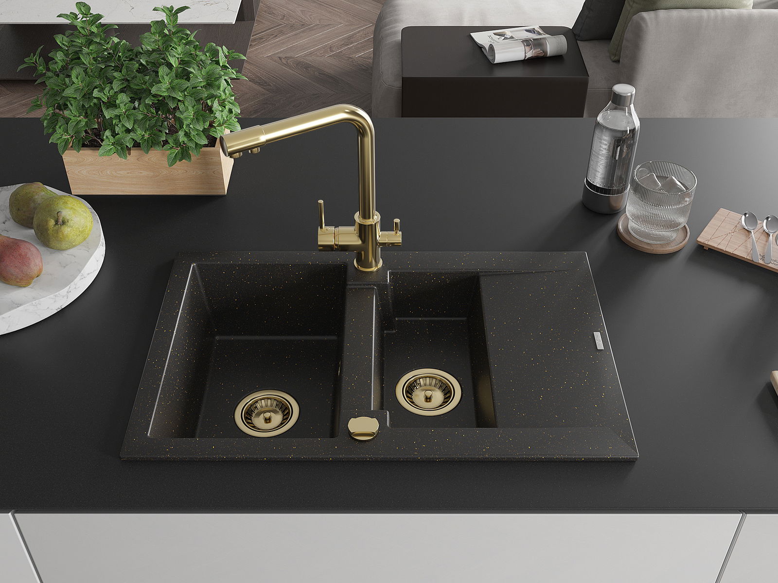 Mexen Gaspar chiuvetă granit 1,5-cupe cu scurgător și baterie de bucătărie Duero, negru/auriu metalizat - 6507-75-671600-50
