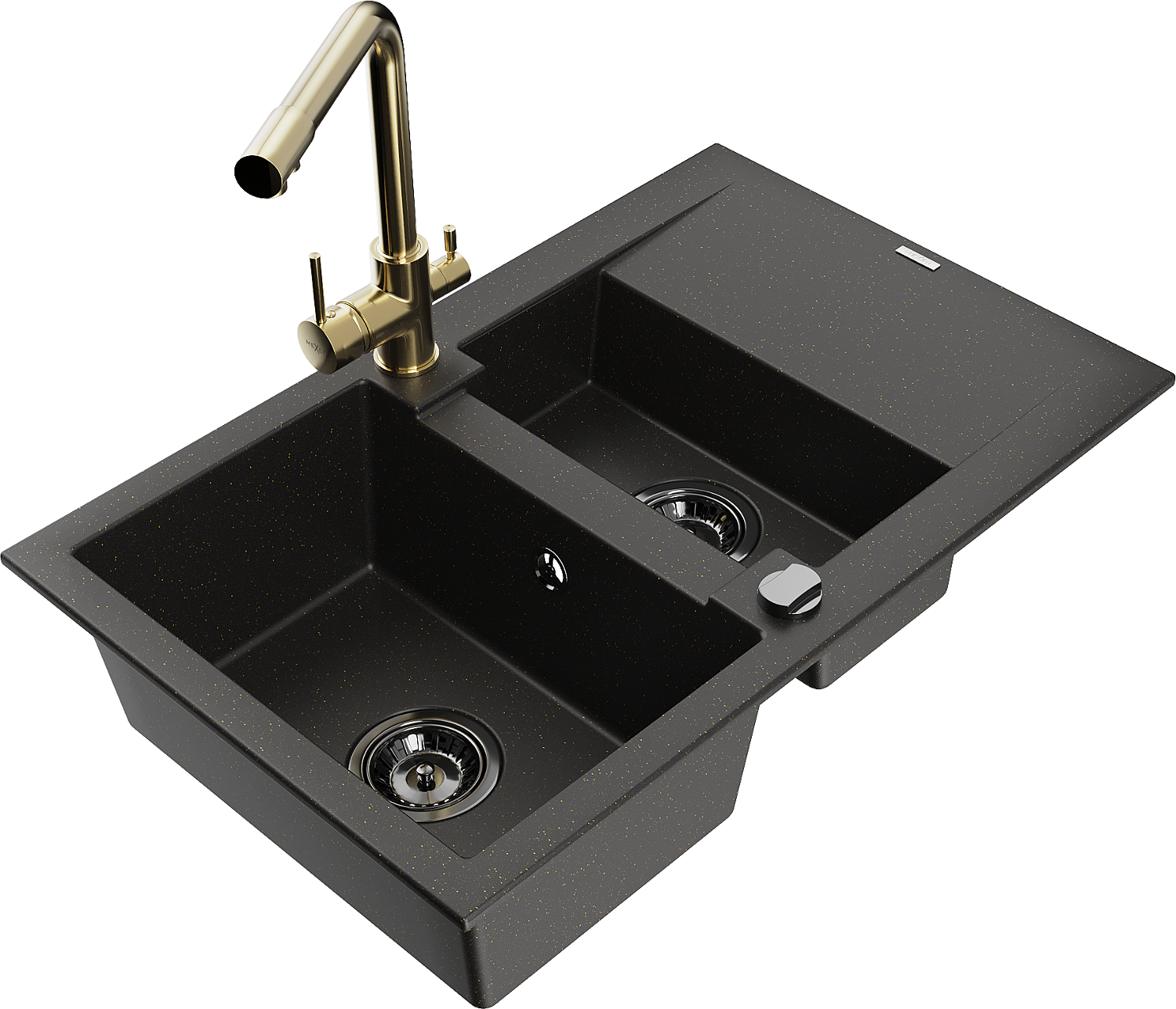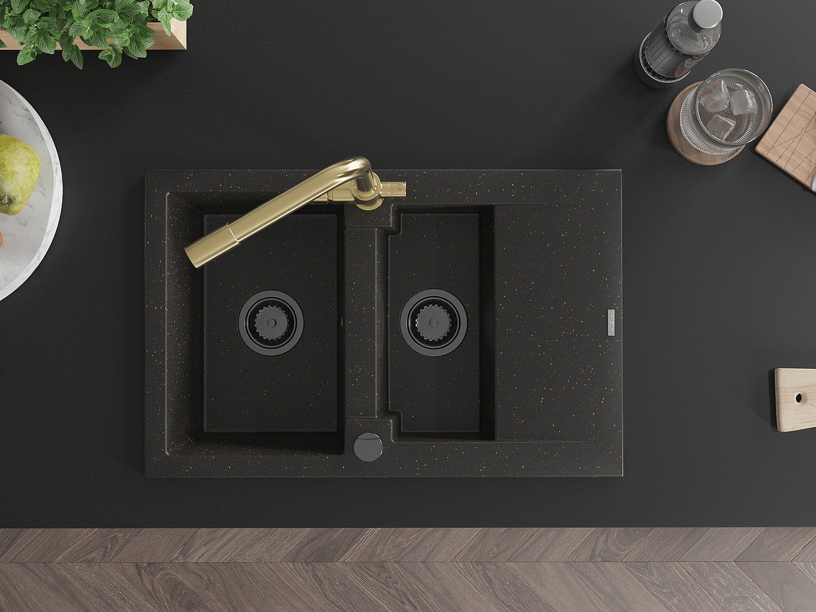 Mexen Gaspar chiuvetă din granit cu 1,5 compartimente cu scurgător și robinet de bucătărie Duero, negru/auriu