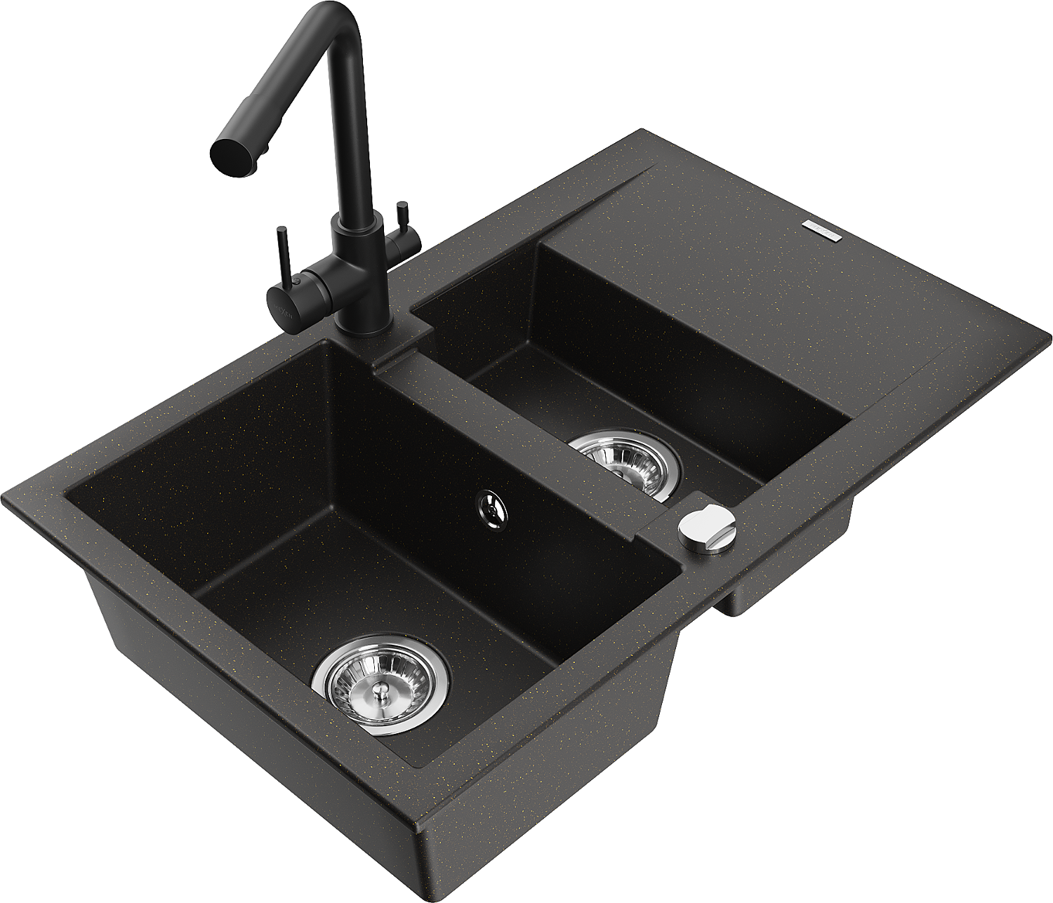 Mexen Gaspar chiuvetă din granit cu 1,5 cuve cu scurgător și baterie de bucătărie Duero, negru/auriu - 6507-75-671600-70