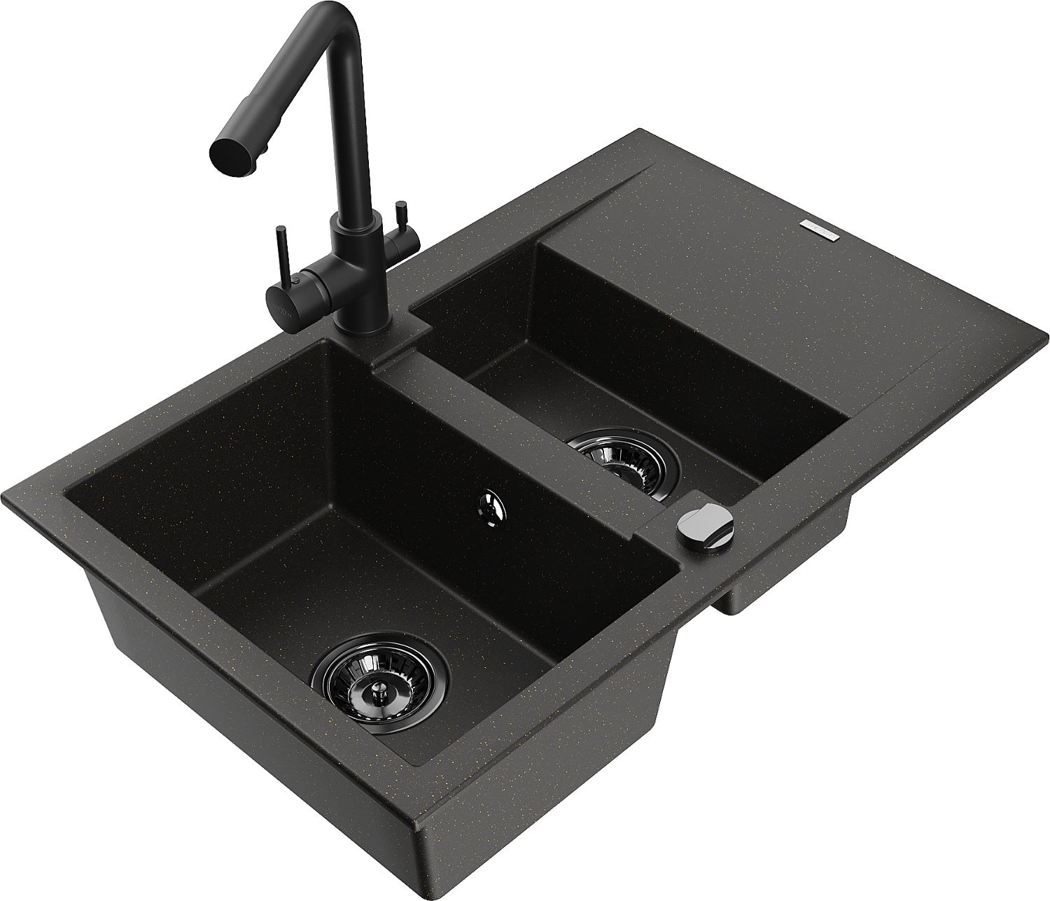 Mexen Gaspar chiuvetă de granit cu 1,5 cuve cu scurgător și baterie de bucătărie Duero, negru/auriu - 6507-75-671600-70-B