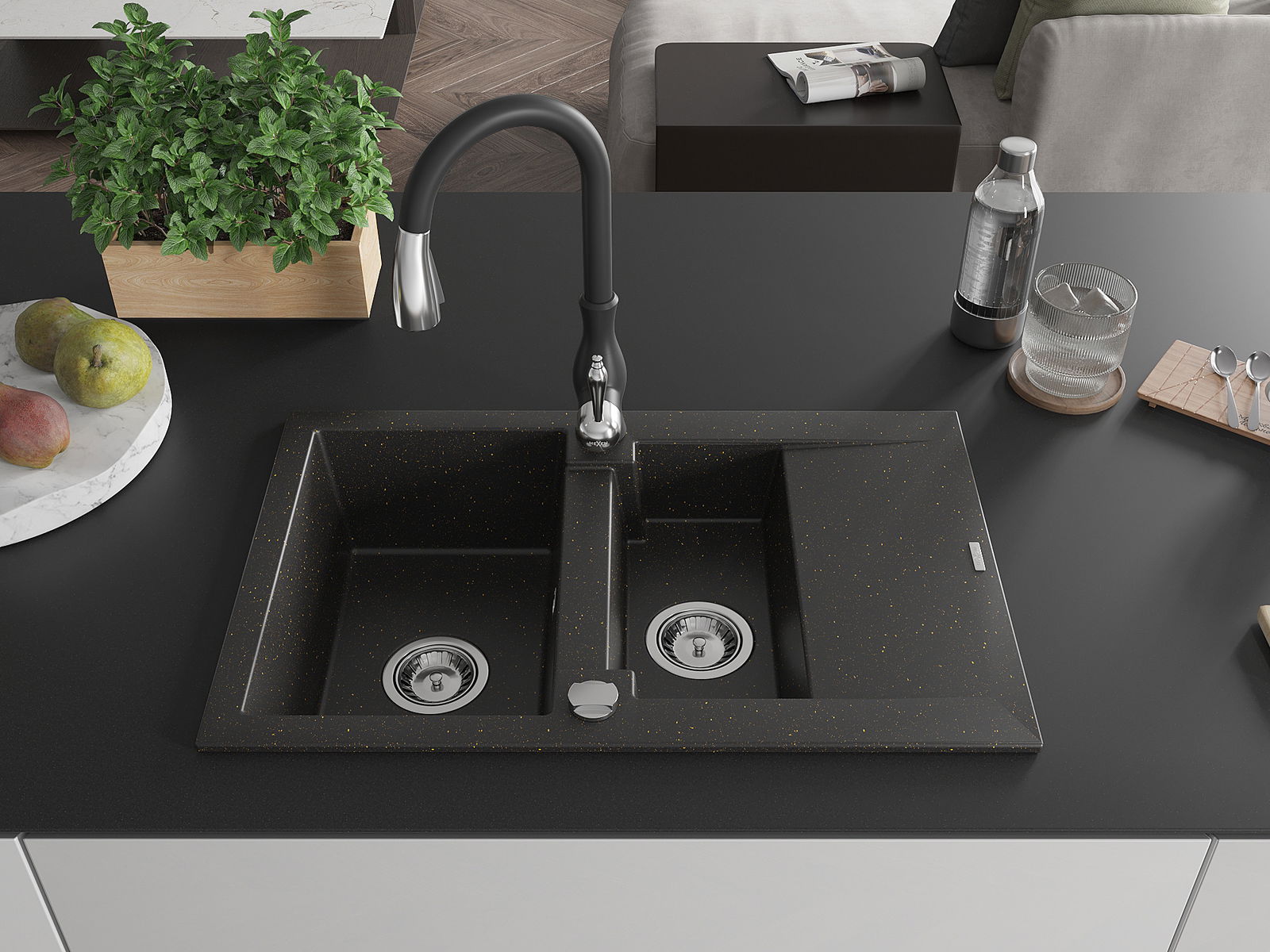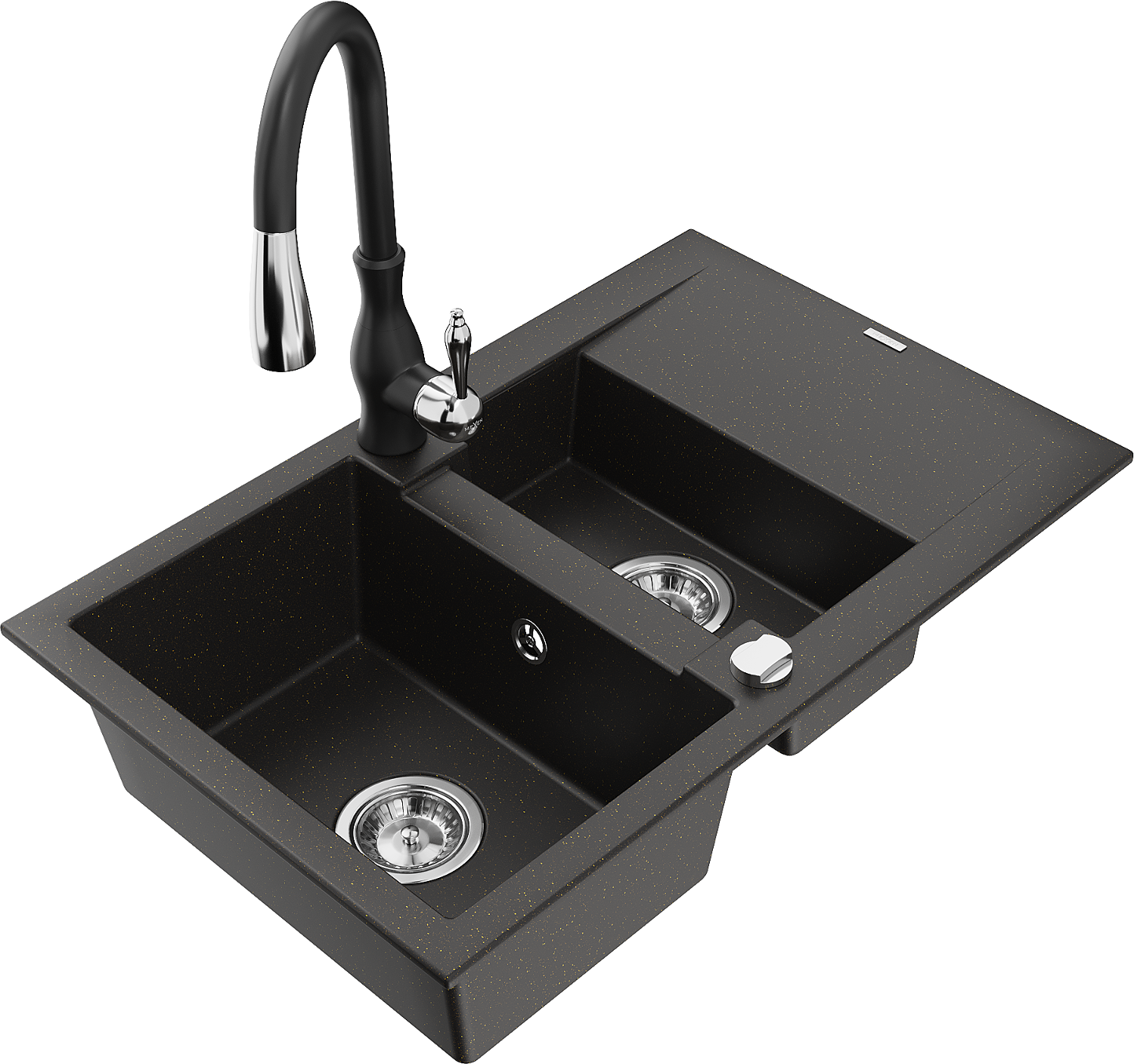 Mexen Gaspar chiuvetă de granit cu 1,5 compartimente cu scurgător și baterie de bucătărie Savita, negru/auriu