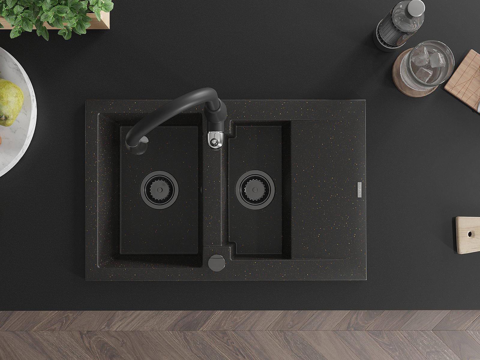 Mexen Gaspar chiuvetă de granit cu 1,5 compartimente cu scurgător și baterie de bucătărie Savita, negru/auriu