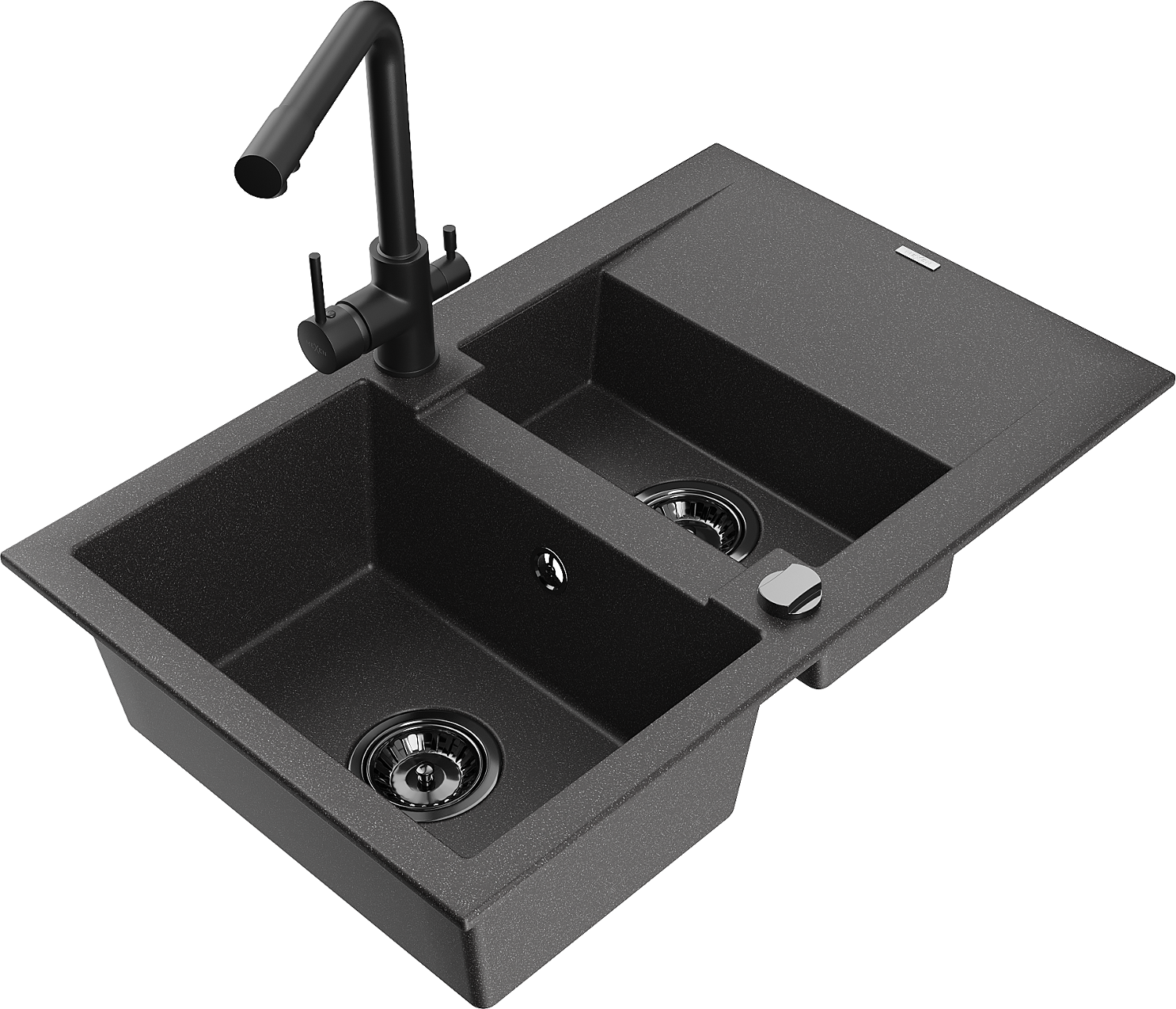 Mexen Gaspar chiuvetă de granit cu 1,5 compartimente cu scurgător și baterie de bucătărie Duero, negru cu pete