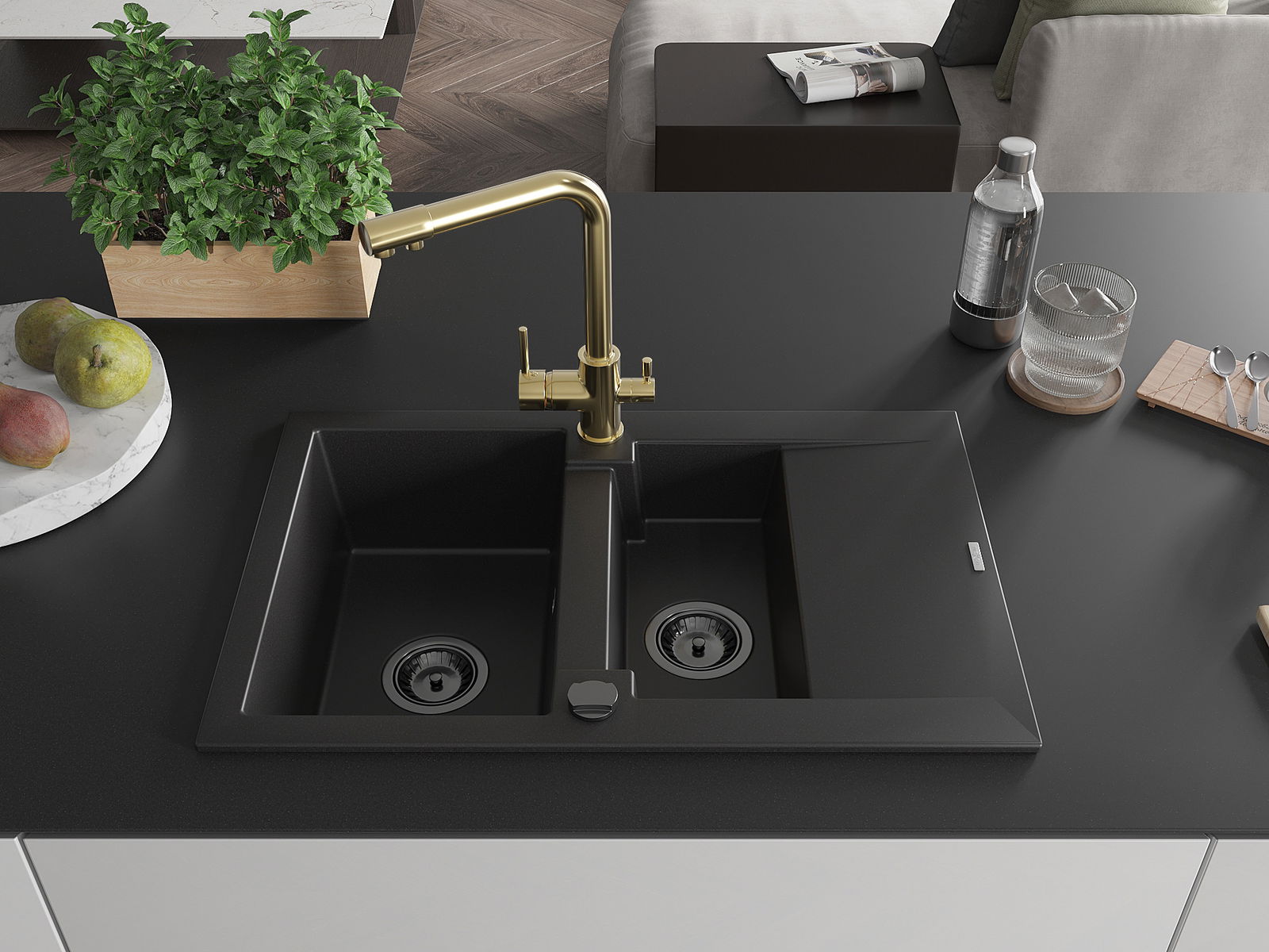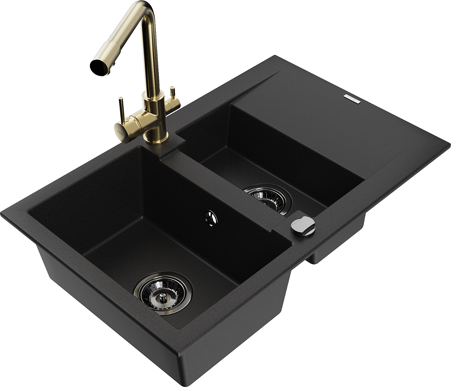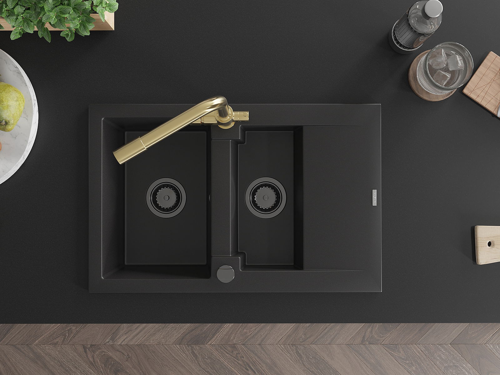 Mexen Gaspar chiuvetă din granit cu 1,5 cuve cu picurător și robinet de bucătărie Duero, negru - 6507-77-671600-50-B