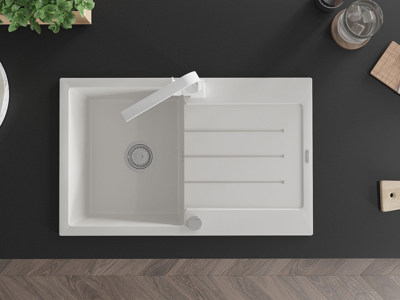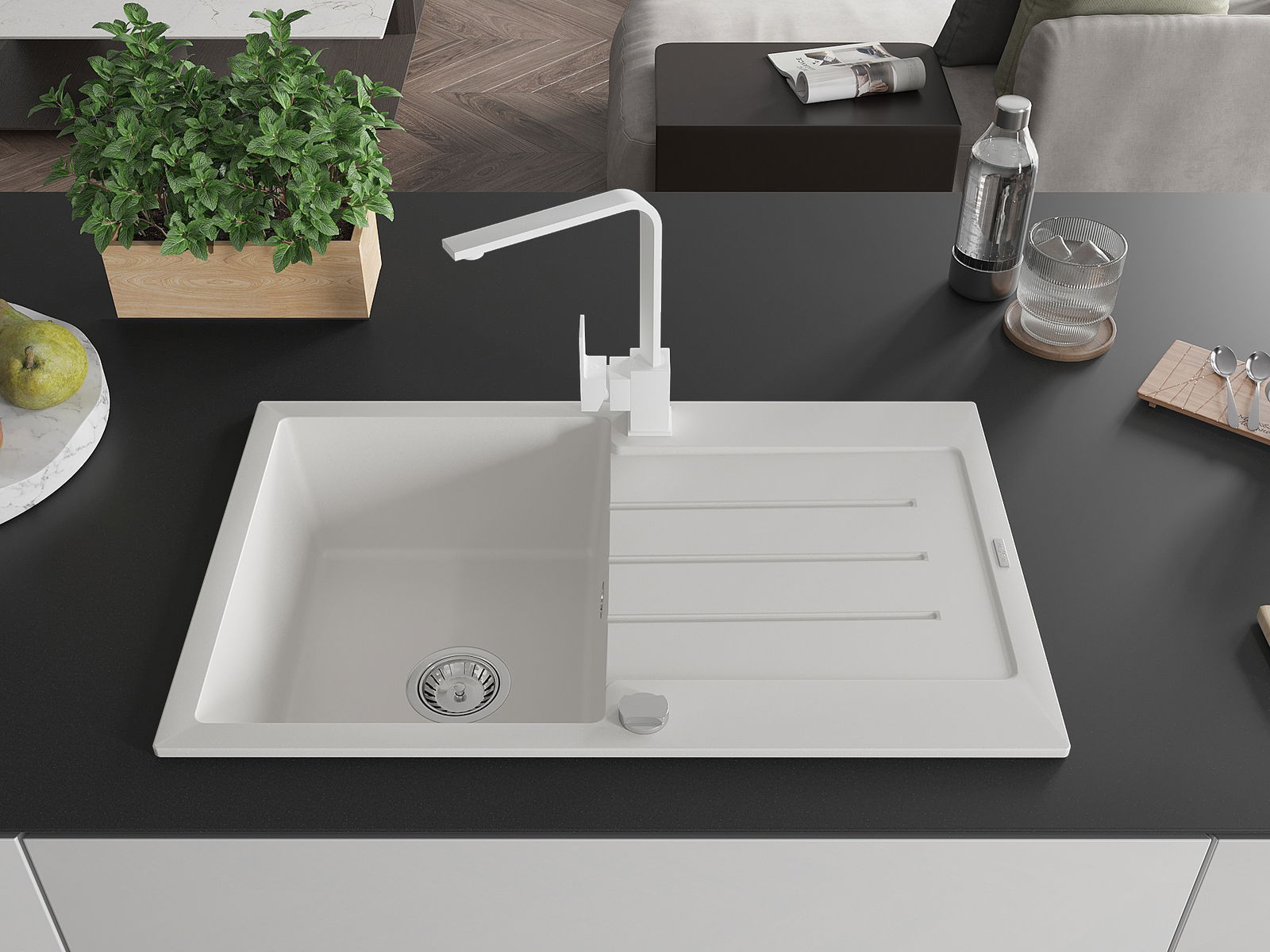 Mexen Bruno chiuvetă din granit cu 1 compartiment cu picurator și baterie de bucătărie Rita, alb - 6513-20-670300-20