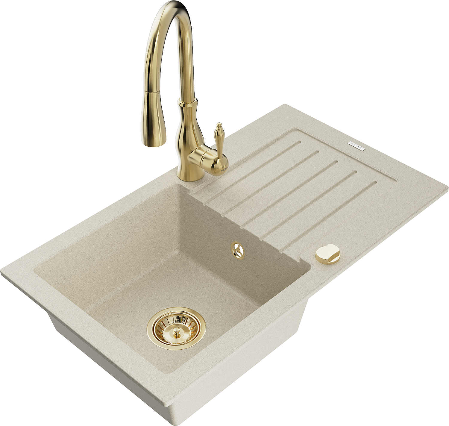 Mexen Pablo chiuvetă de bucătărie din granit cu 1 compartiment și scurgător și baterie Savita, bej - 6510-69-672601-50