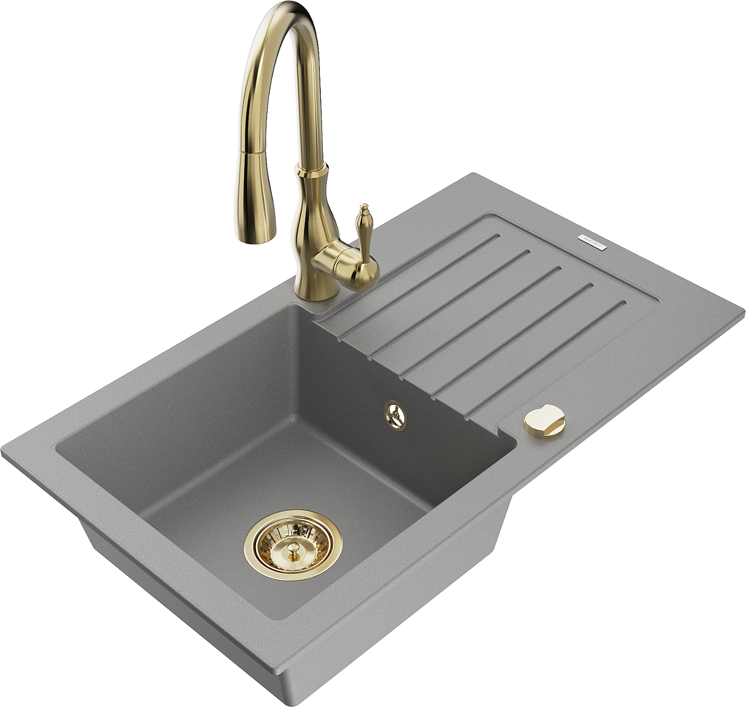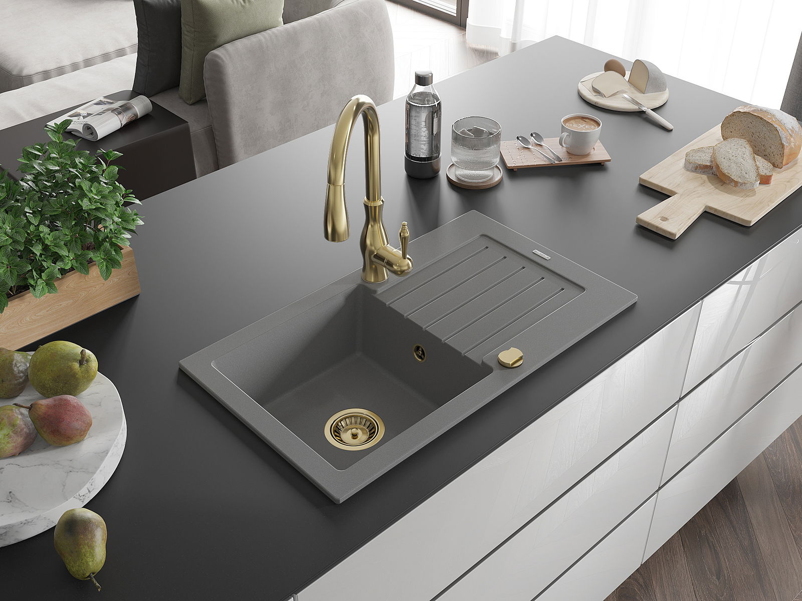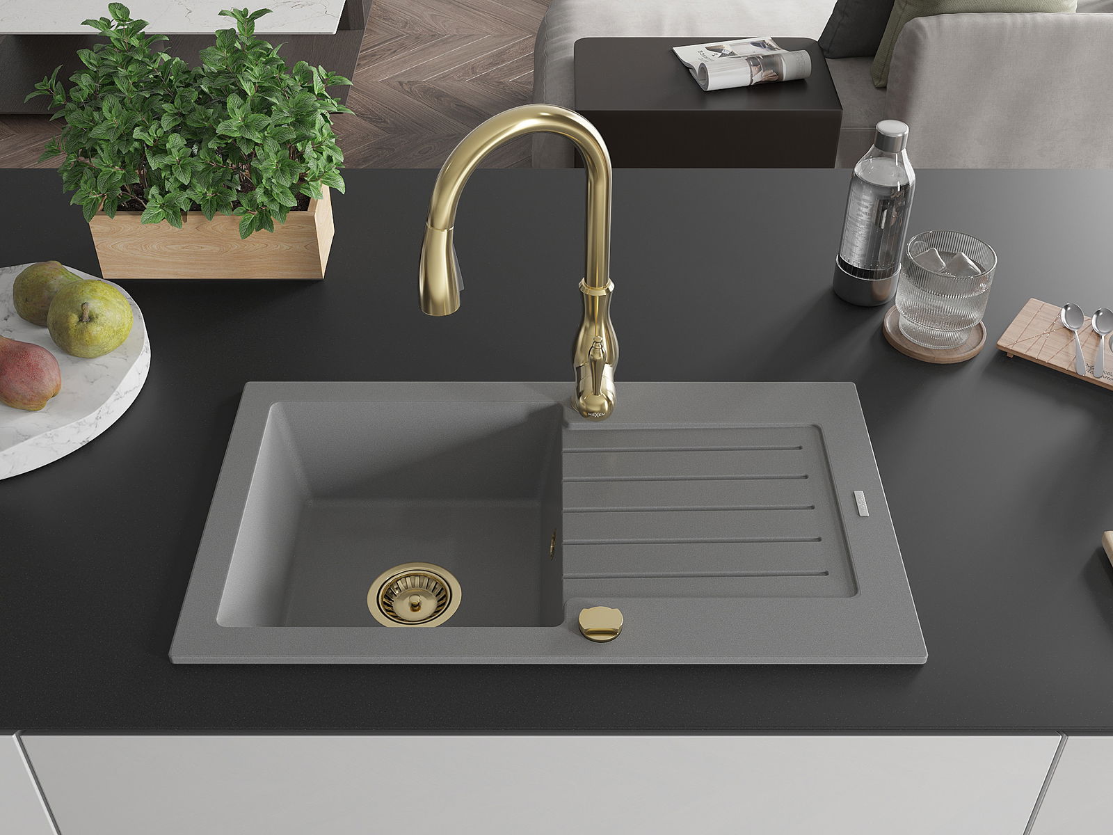 Mexen Pablo chiuvetă de granit cu 1 compartiment și picurător și baterie de bucătărie Savita, gri - 6510-71-672601-50