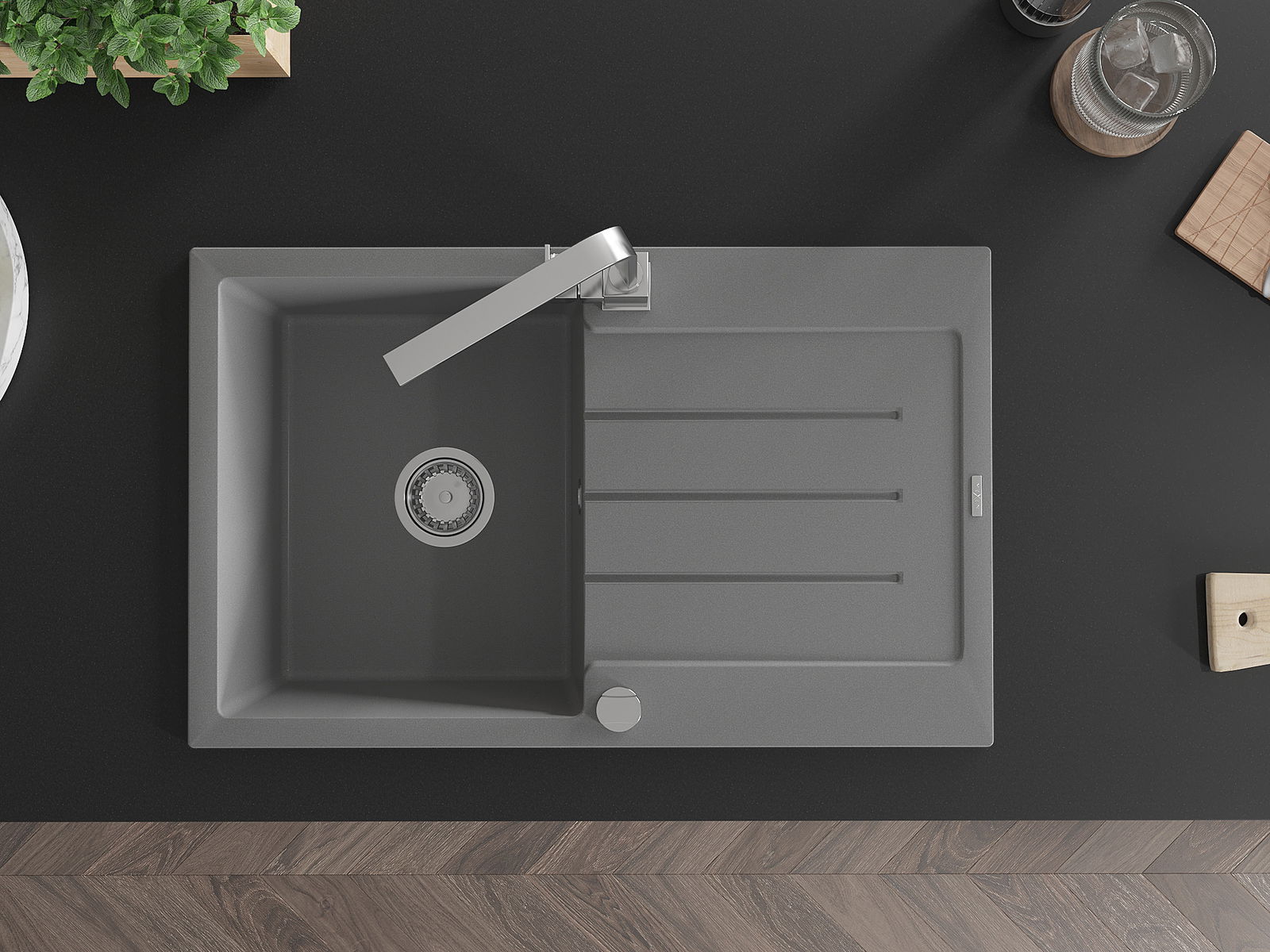 Mexen Bruno chiuvetă din granit cu 1 compartiment cu scurgător și baterie de bucătărie Rita, gri - 6513-71-670300-00