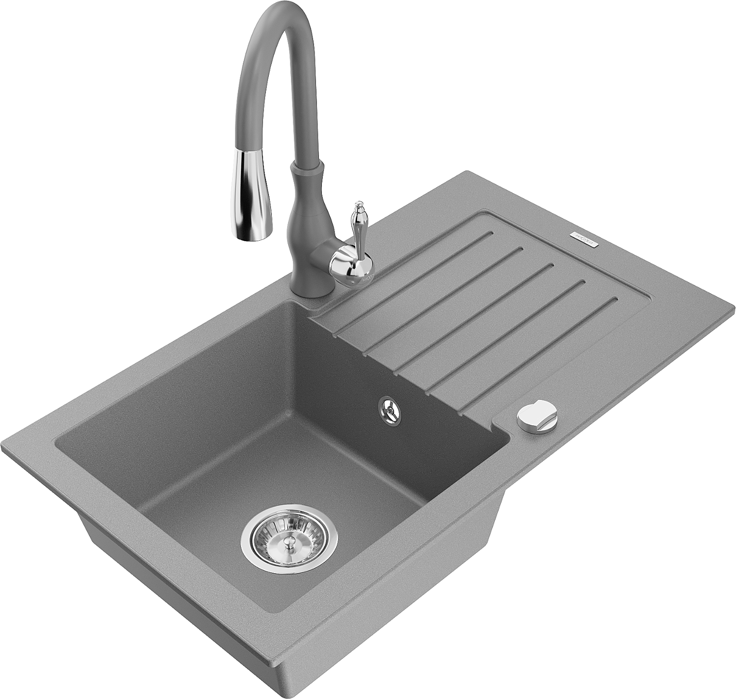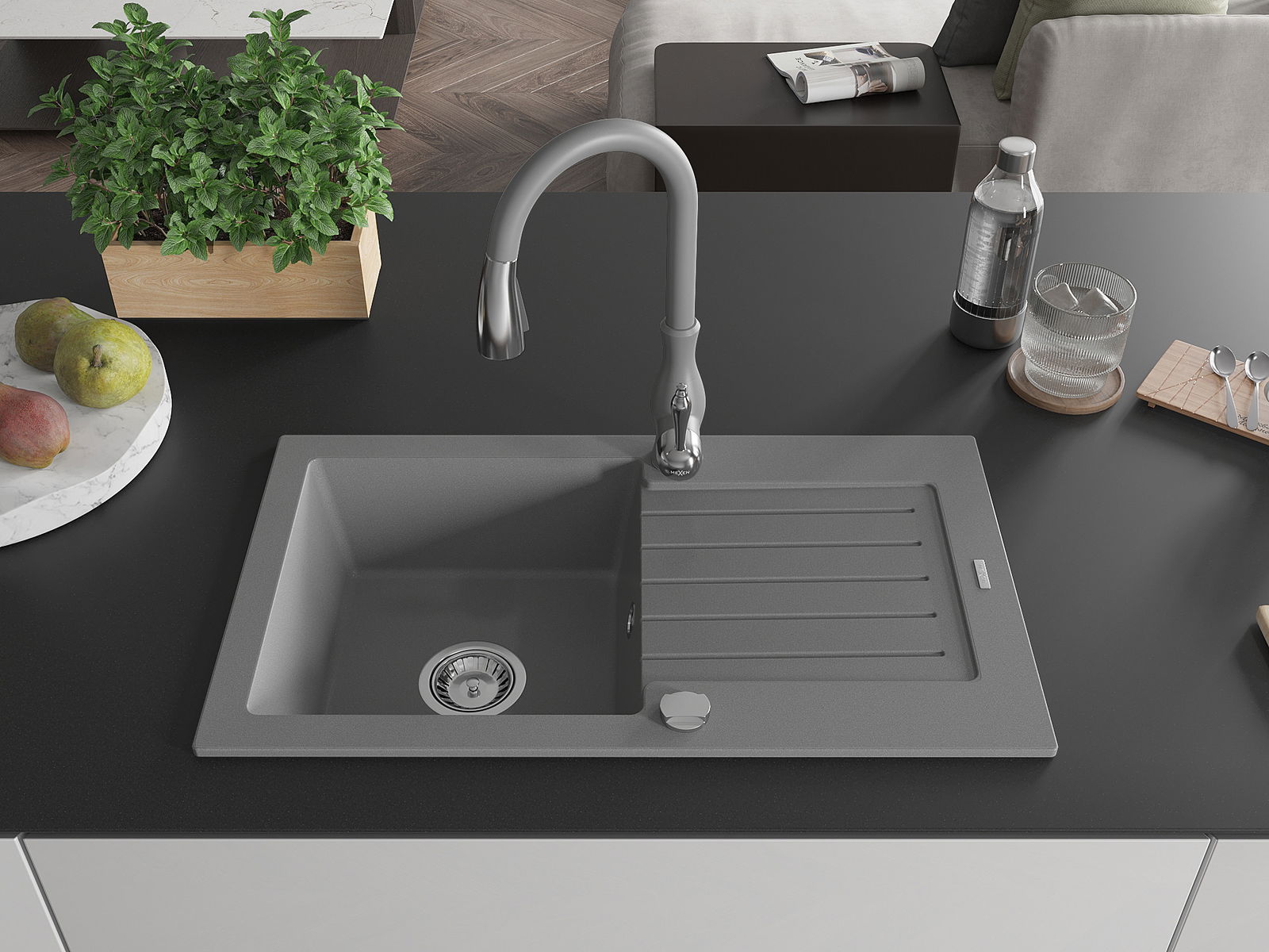 Mexen Pablo chiuvetă din granit cu 1 compartiment și picurător și baterie de bucătărie Savita, gri - 6510-71-672601-71