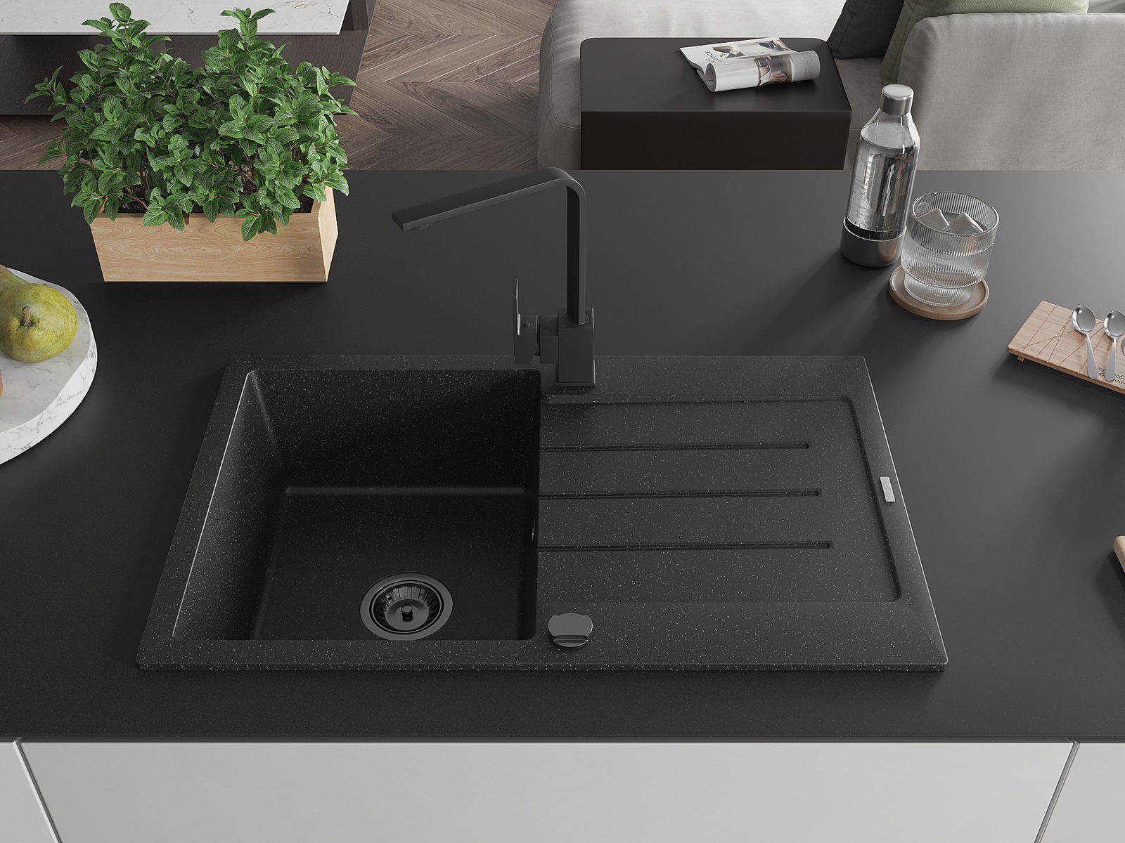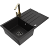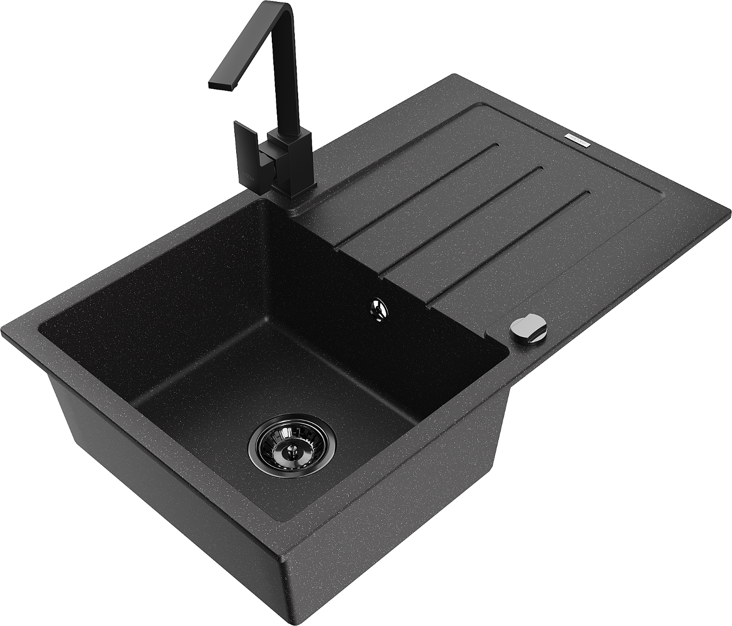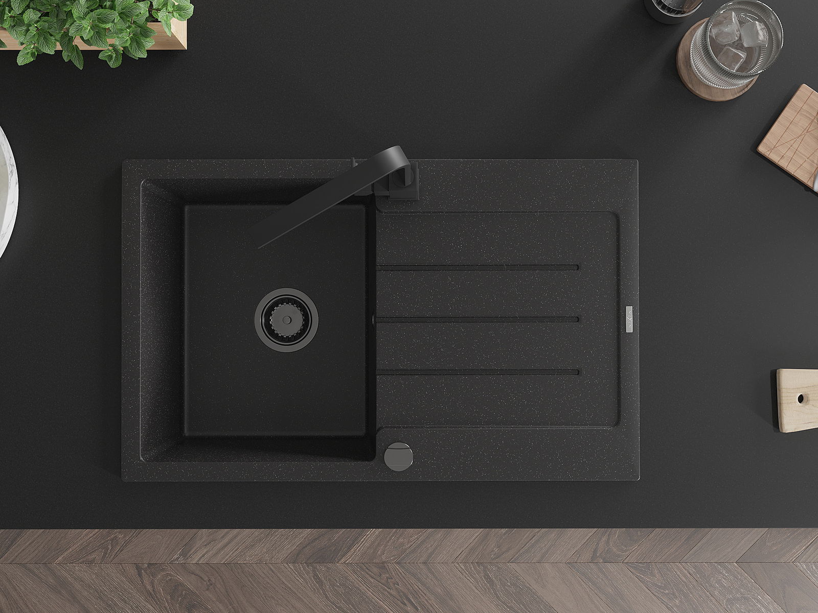 Mexen Bruno chiuvetă granit cu o cuvă și picurător și baterie de bucătărie Rita, negru/argintiu metalic