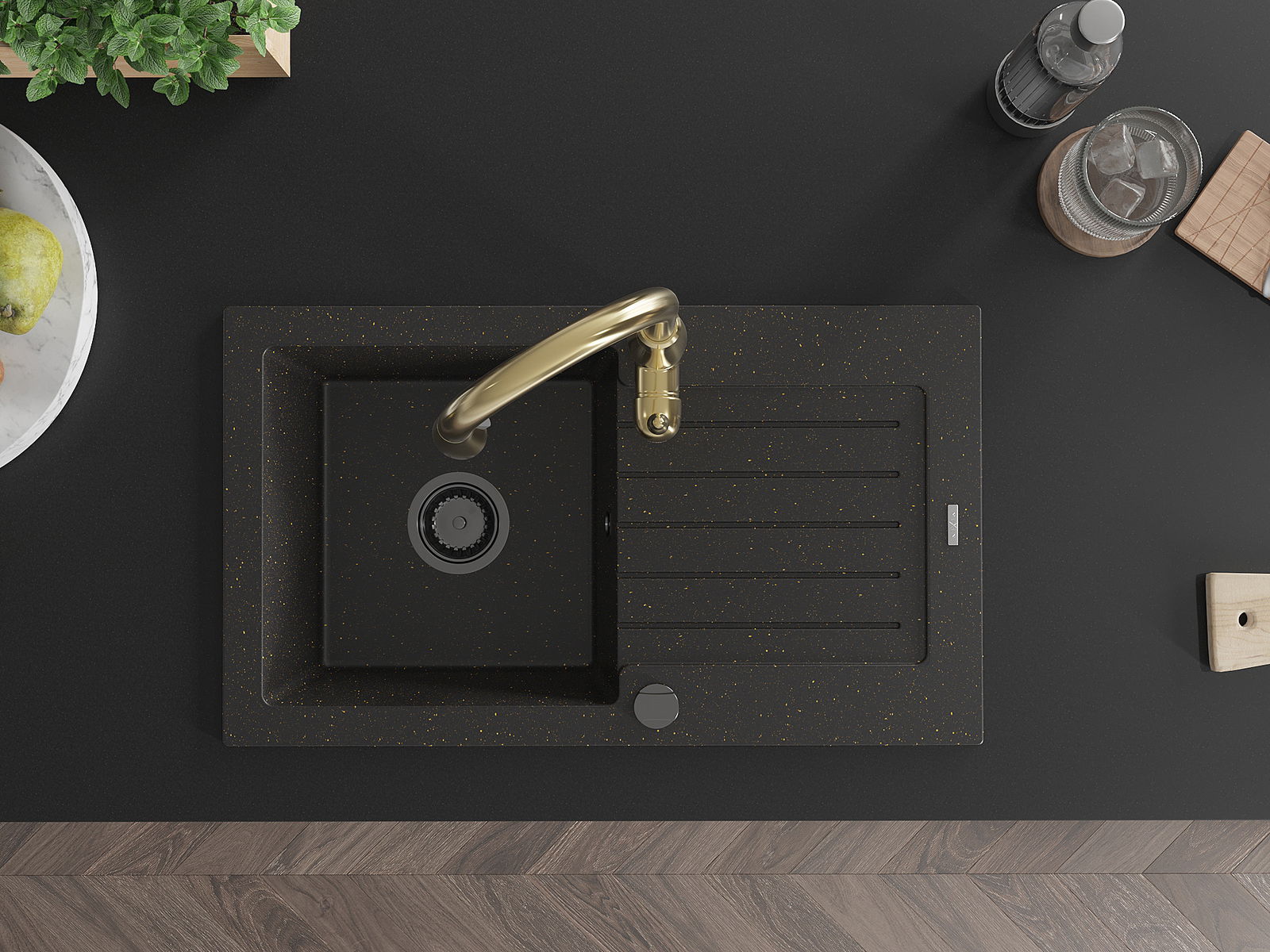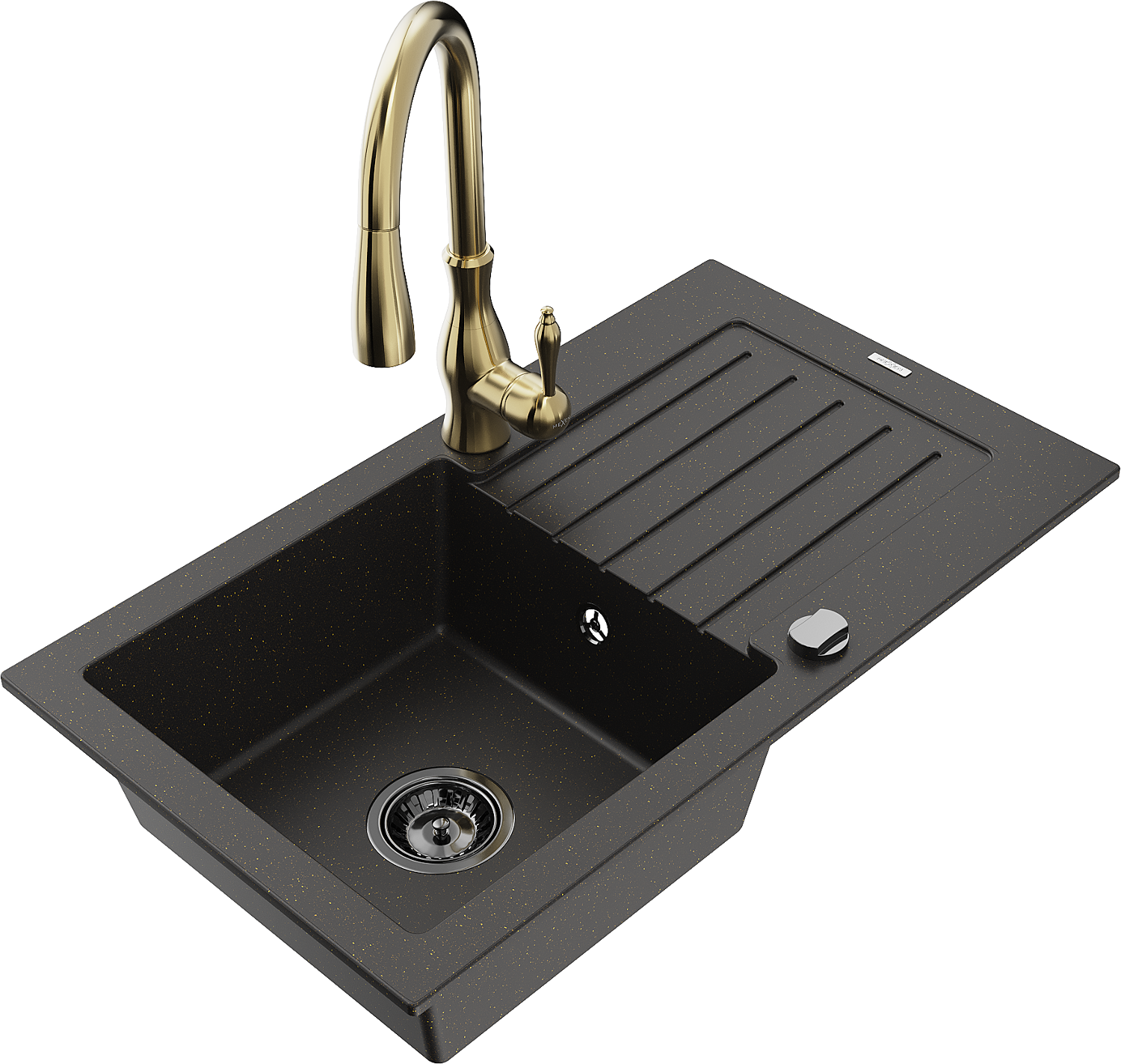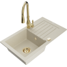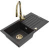 Mexen Pablo chiuvetă de granit cu 1 compartiment cu scurgător și baterie de bucătărie Savita, negru/auriu metalizat