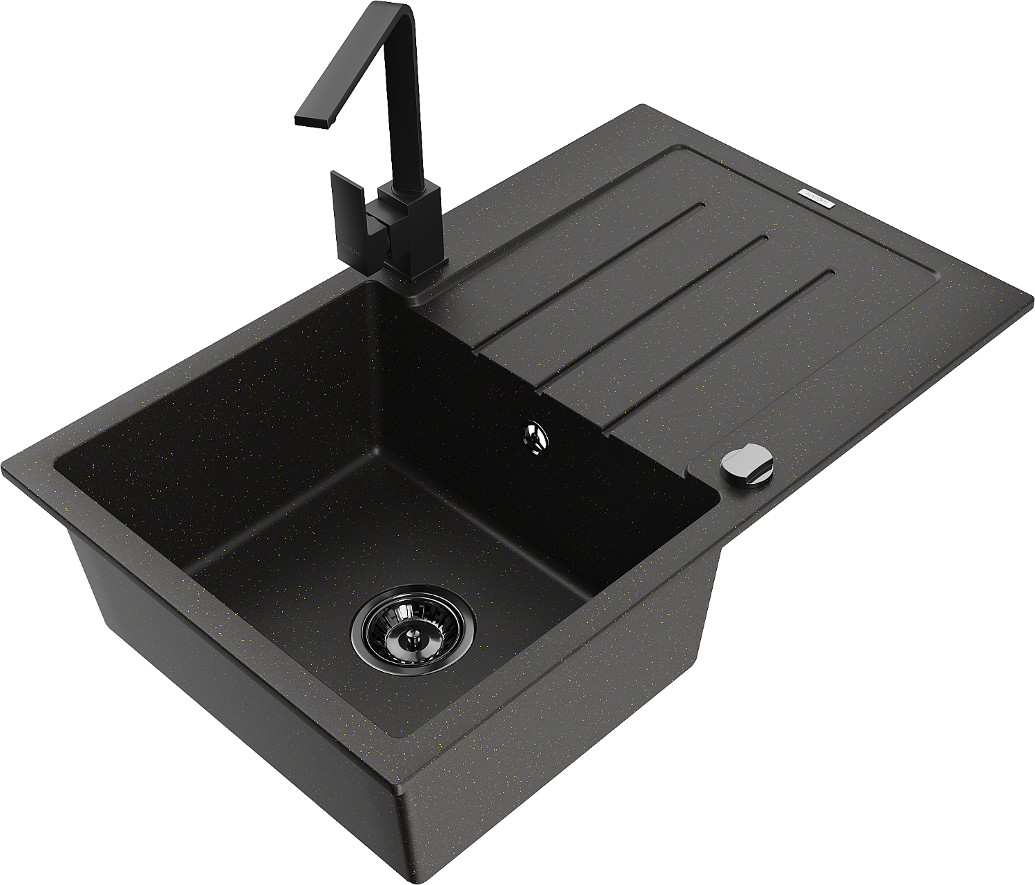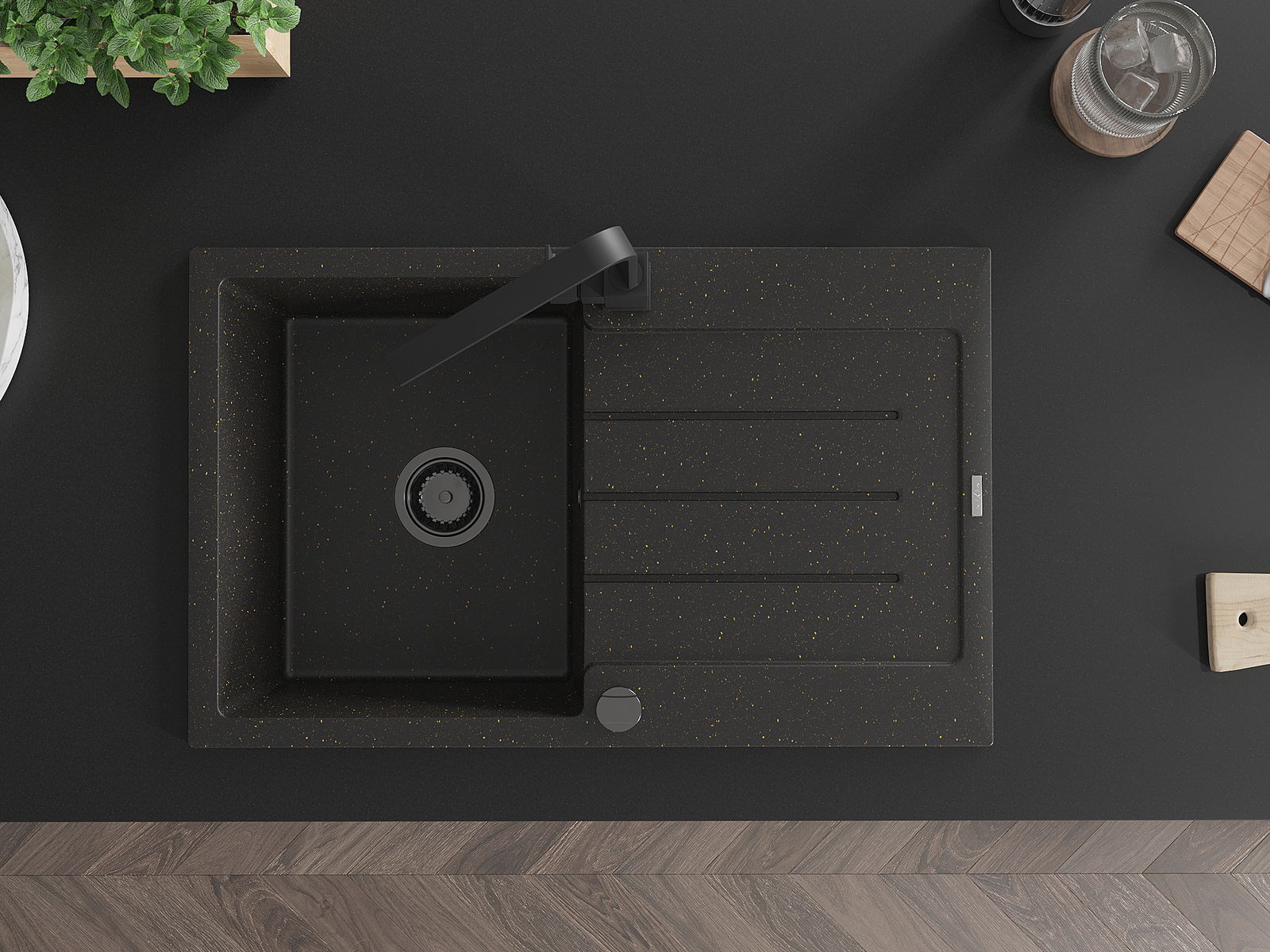 Mexen Bruno chiuvetă de granit cu o cuvă și scurgător, cu baterie de bucătărie Rita, negru/auriu metalizat