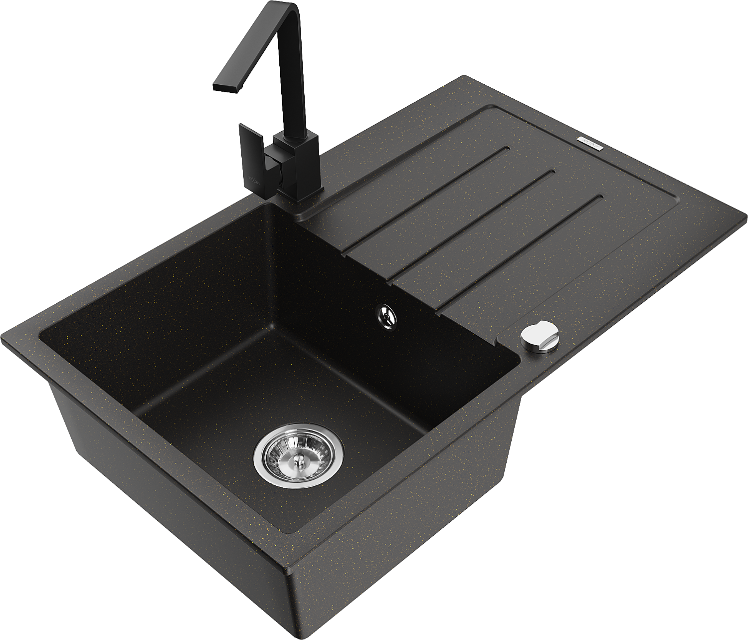 Mexen Bruno chiuvetă de granit cu o cuvă, cu scurgător și baterie de bucătărie Rita, negru/auriu metalizat