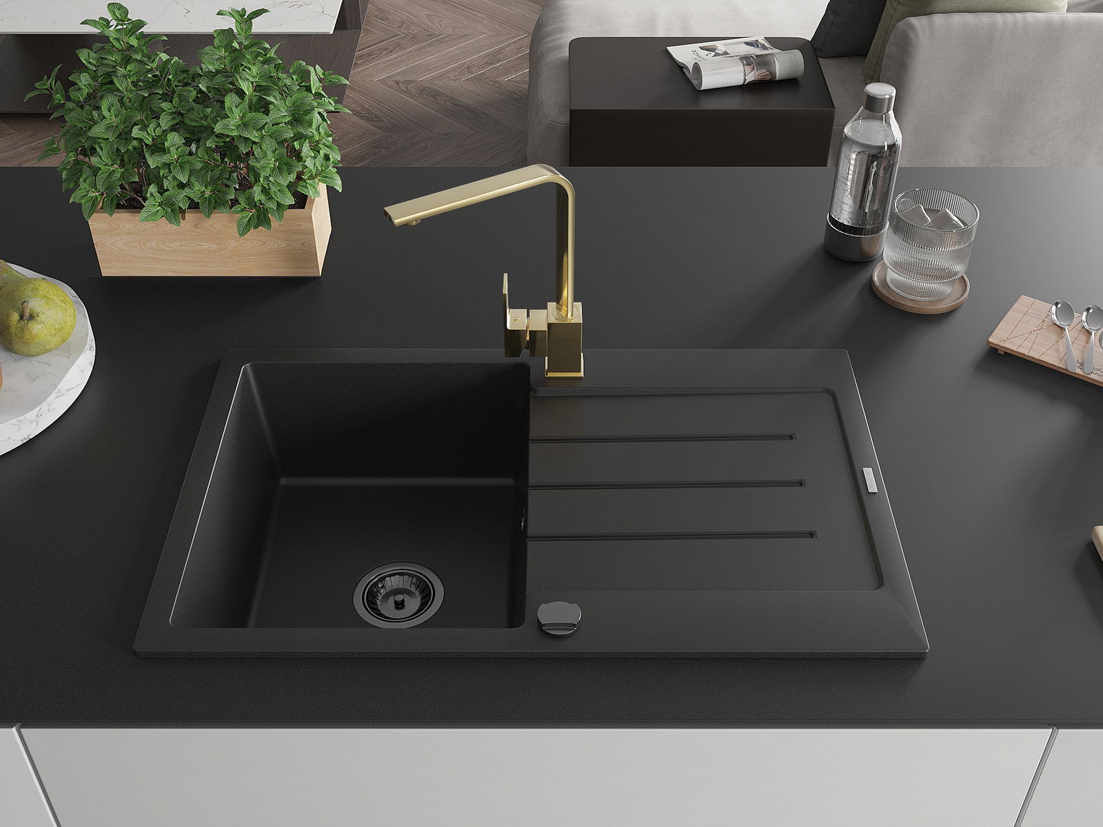 Mexen Bruno chiuvetă granit 1-cameră cu scurgător și robinet de bucătărie Rita, negru - 6513-77-670300-50-B