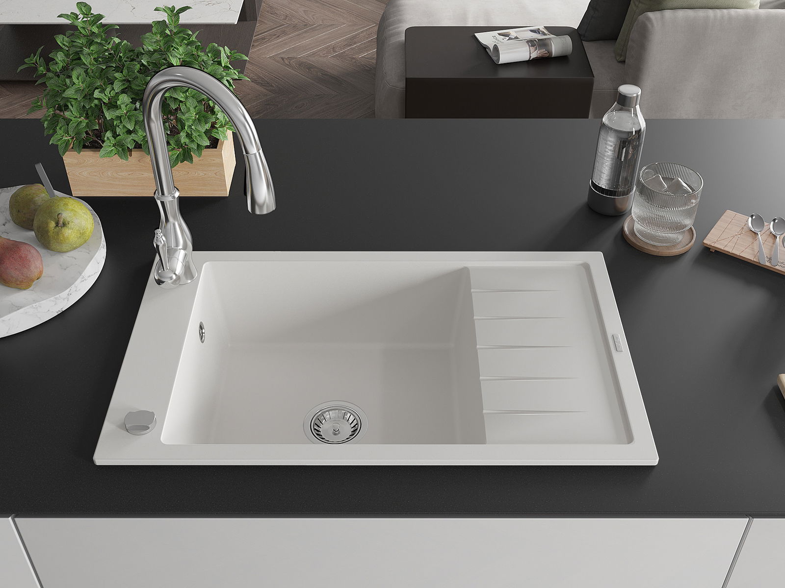 Suprafața chiuvetei este rezistentă la pete și decolorarea, datorită căreia este ușor de curățat și își păstrează culoarea mult timp. Estetică și practic completarea fiecărei bucătării.