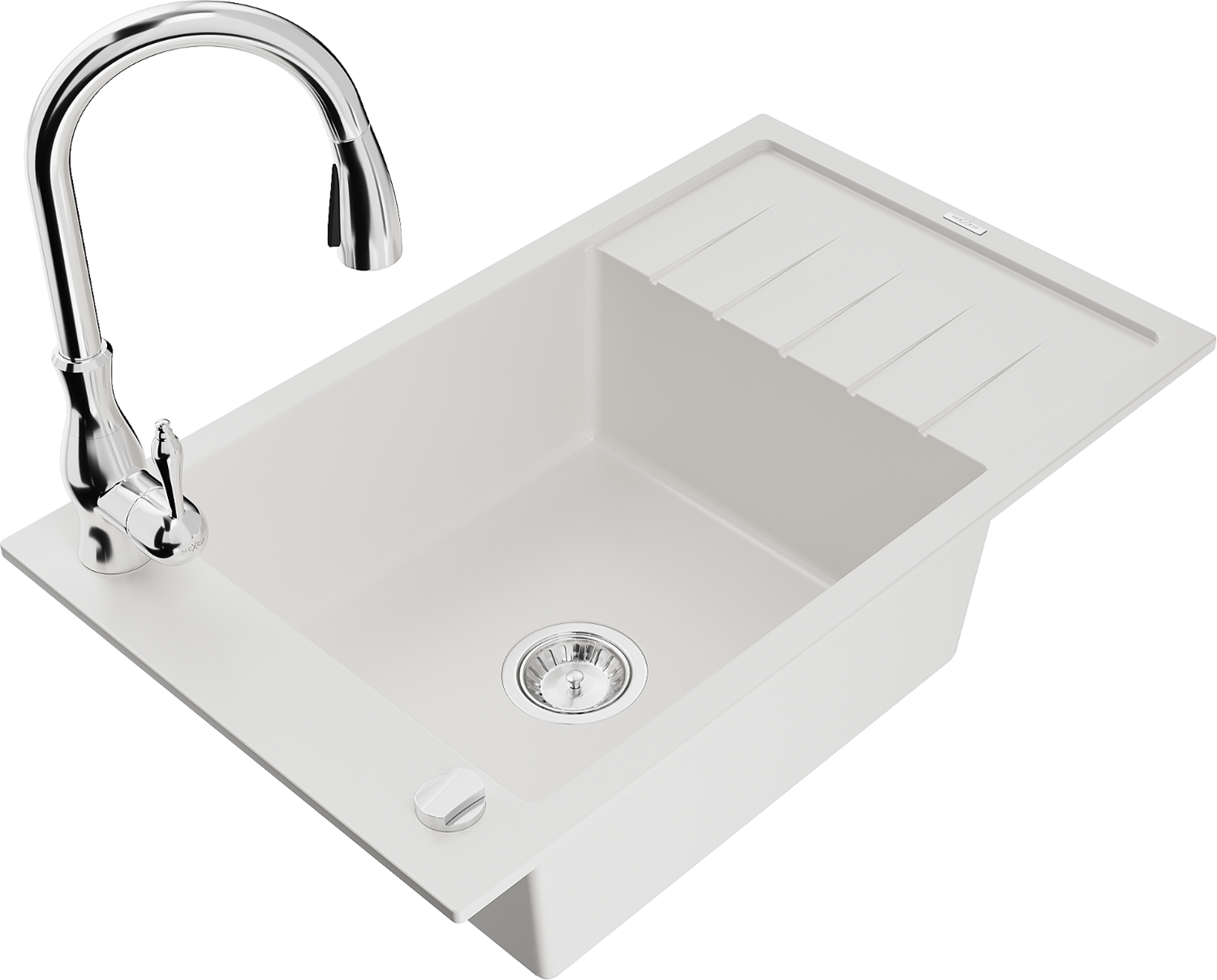 Mexen Elias chiuvetă de granit cu 1 compartiment cu picurător și baterie de bucătărie Savita, alb - 6511-20-672601-00