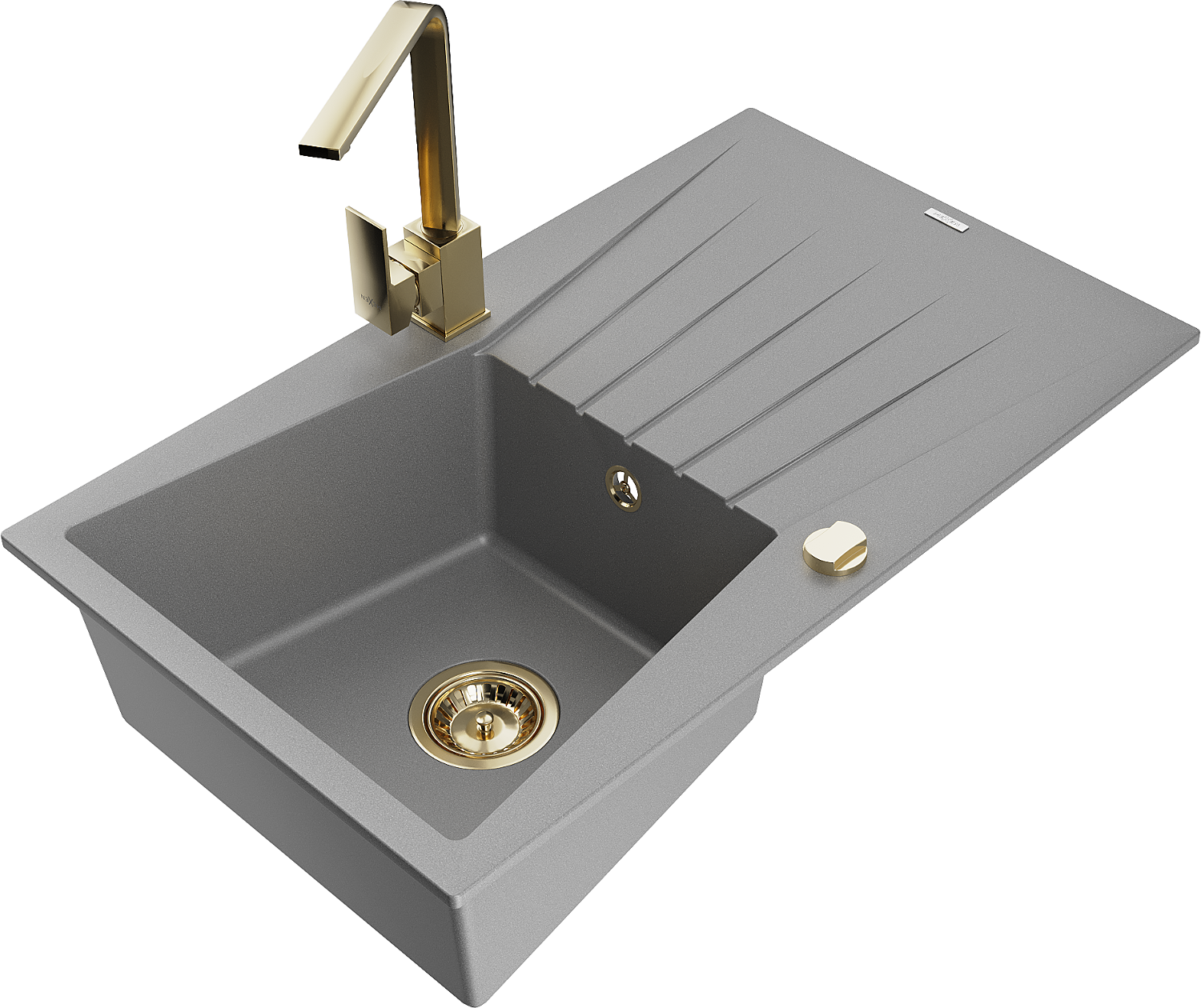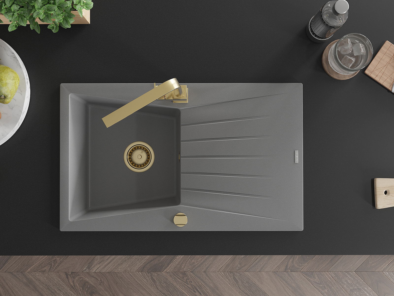 Mexen Cesar chiuvetă de granit cu o singură cuvă și scurgător, cu baterie de bucătărie Rita, gri - 6514-71-670300-50