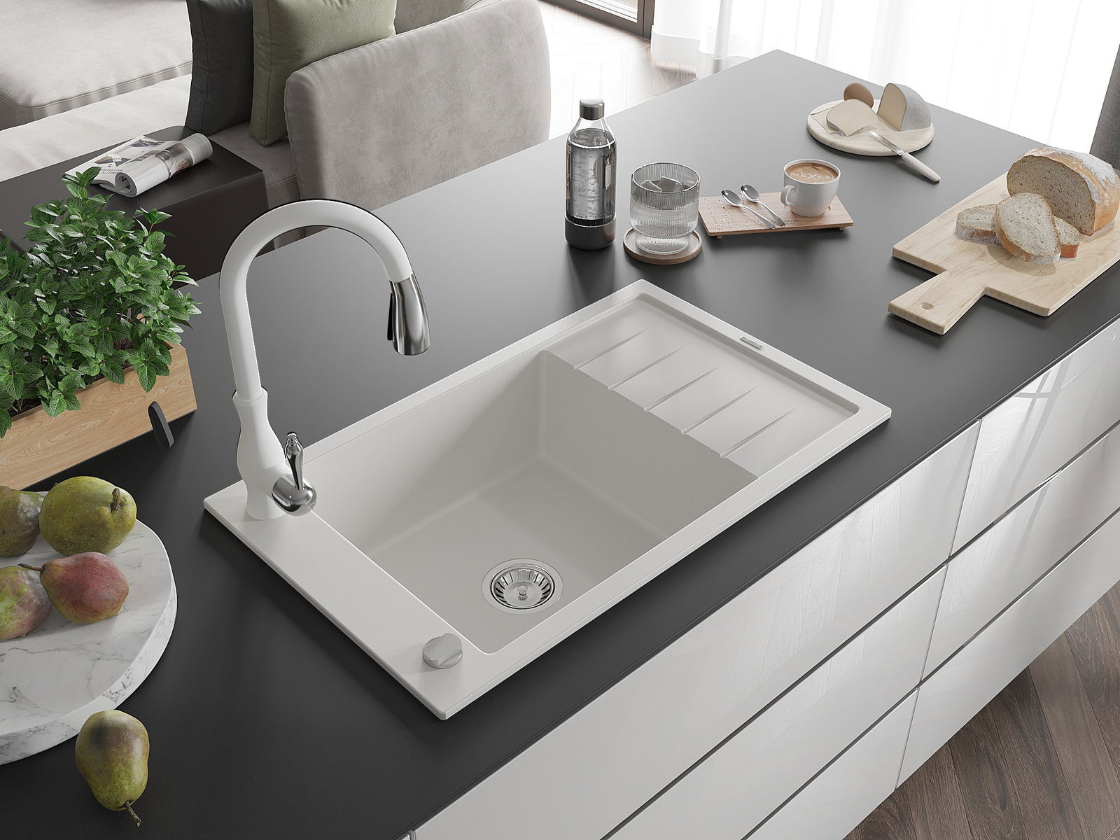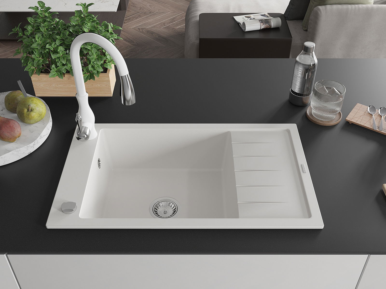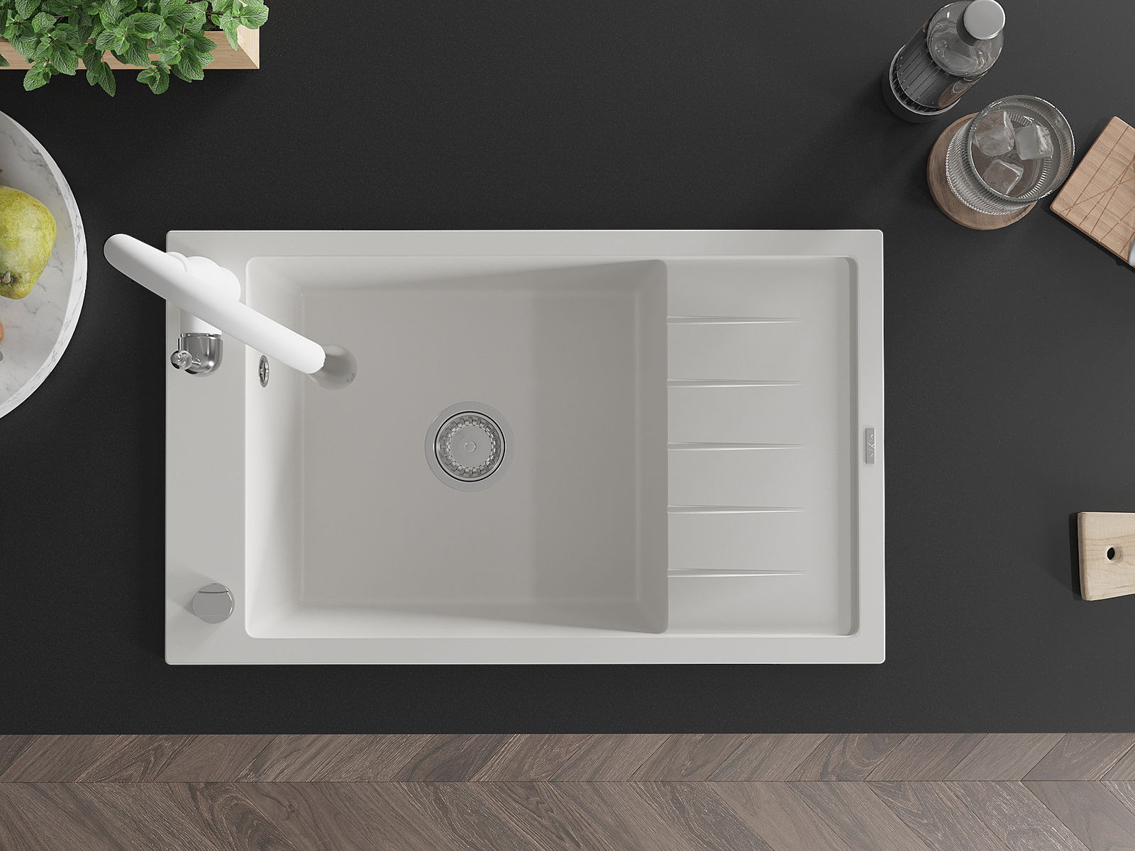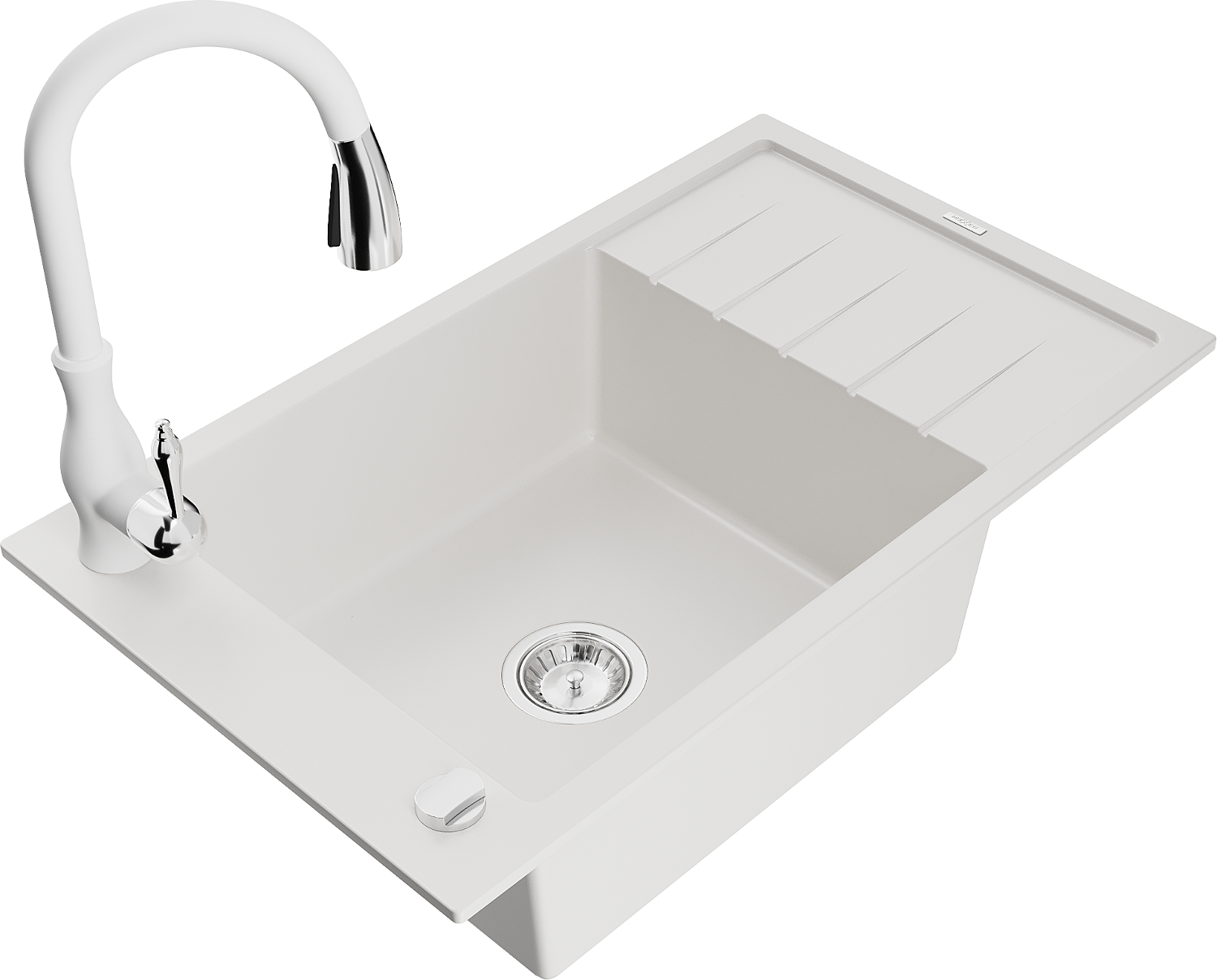 Mexen Elias chiuvetă de bucătărie din granit cu o cuvă și scurgător și baterie de bucătărie Savita, alb - 6511-20-672601-20