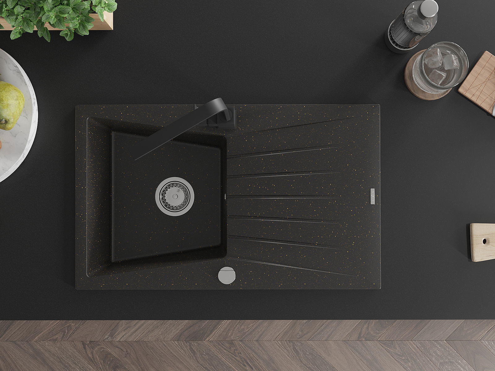 Mexen Cesar chiuvetă din granit cu 1 cuvă, scurgător și baterie de bucătărie Rita, negru/auriu metalic - 6514-75-670300-70