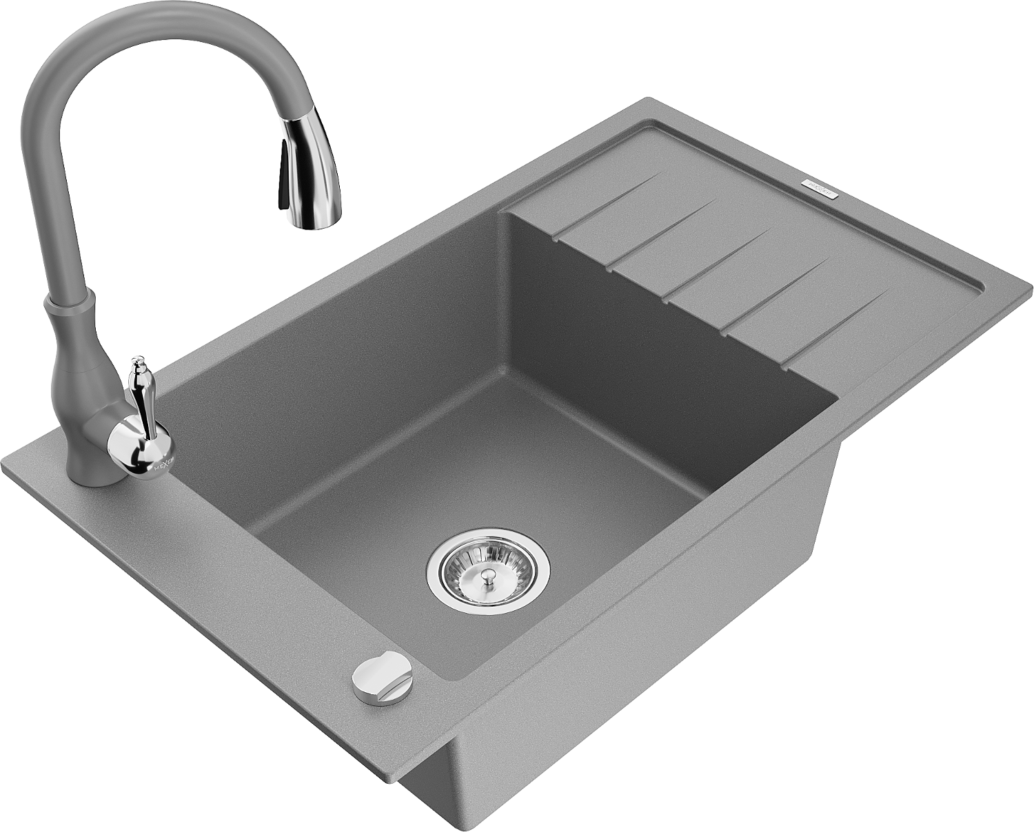Mexen Elias chiuvetă de granit cu 1 compartiment cu scurgător și baterie de bucătărie Savita, gri - 6511-71-672601-71