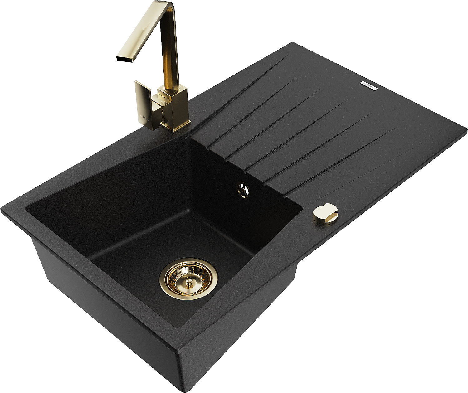 Mexen Cesar chiuvetă de granit cu 1 compartiment cu scurgător și baterie de bucătărie Rita, negru - 6514-77-670300-50