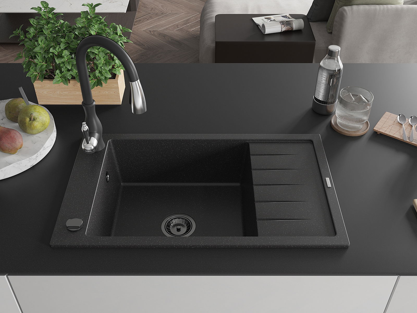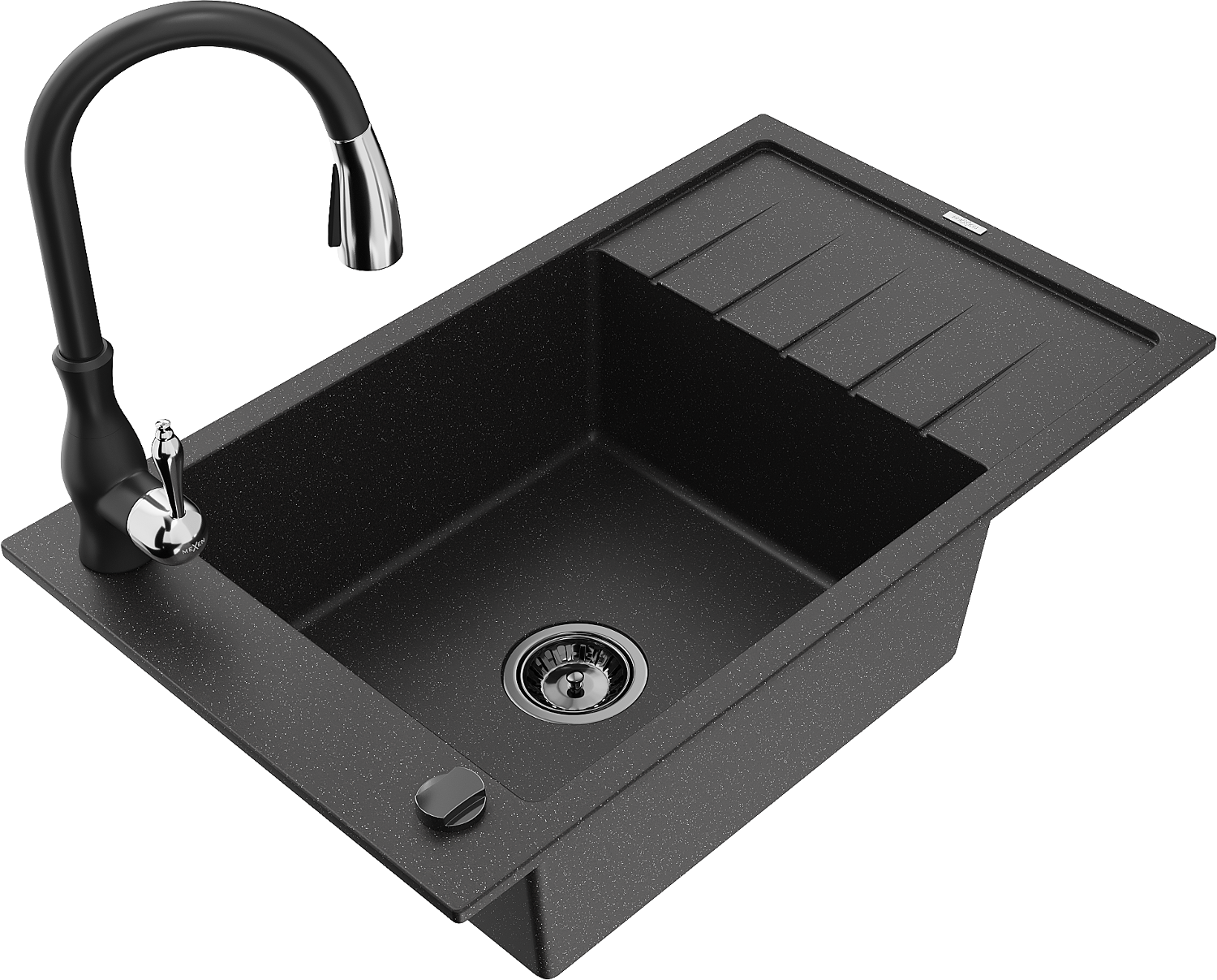 Mexen Elias chiuvetă granitică cu o singură cuvă, cu scurgător și cu baterie de bucătărie Savita, negru/argintiu metalic