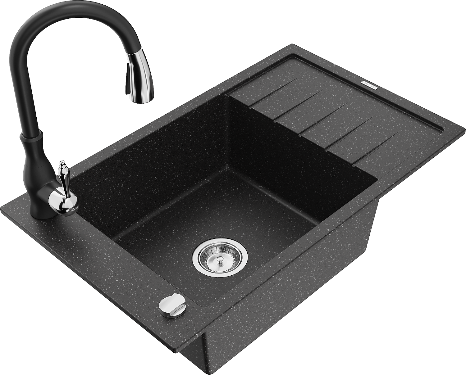 Mexen Elias chiuvetă de bucătărie din granit cu 1 compartiment, cu picurător și baterie de bucătărie Savita,