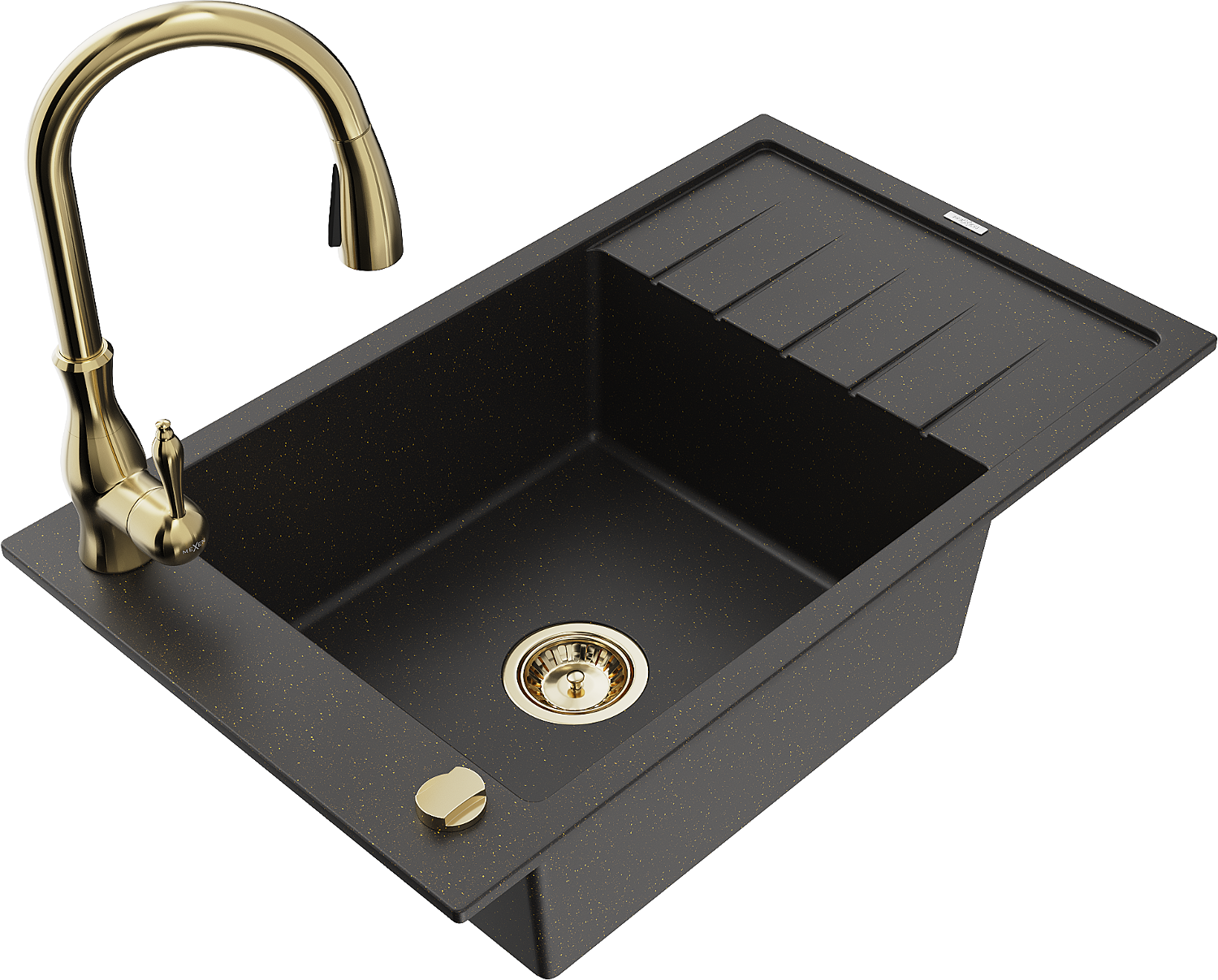Mexen Elias chiuvetă de granit cu 1 compartiment cu scurgător și baterie de bucătărie Savita, negru/auriu metalic