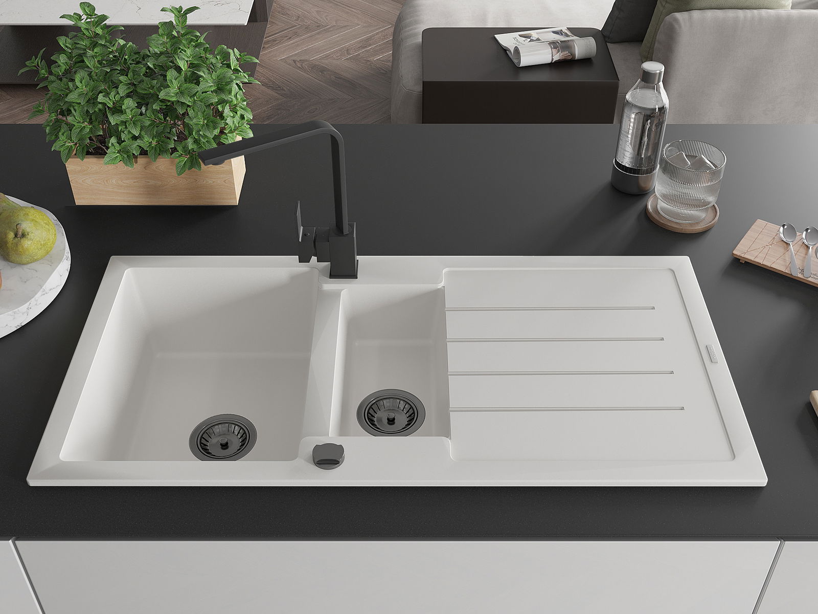 Mexen Andres chiuvetă de granit cu 1,5 compartimente cu scurgător și baterie de bucătărie Rita, alb - 6515-20-670300-70