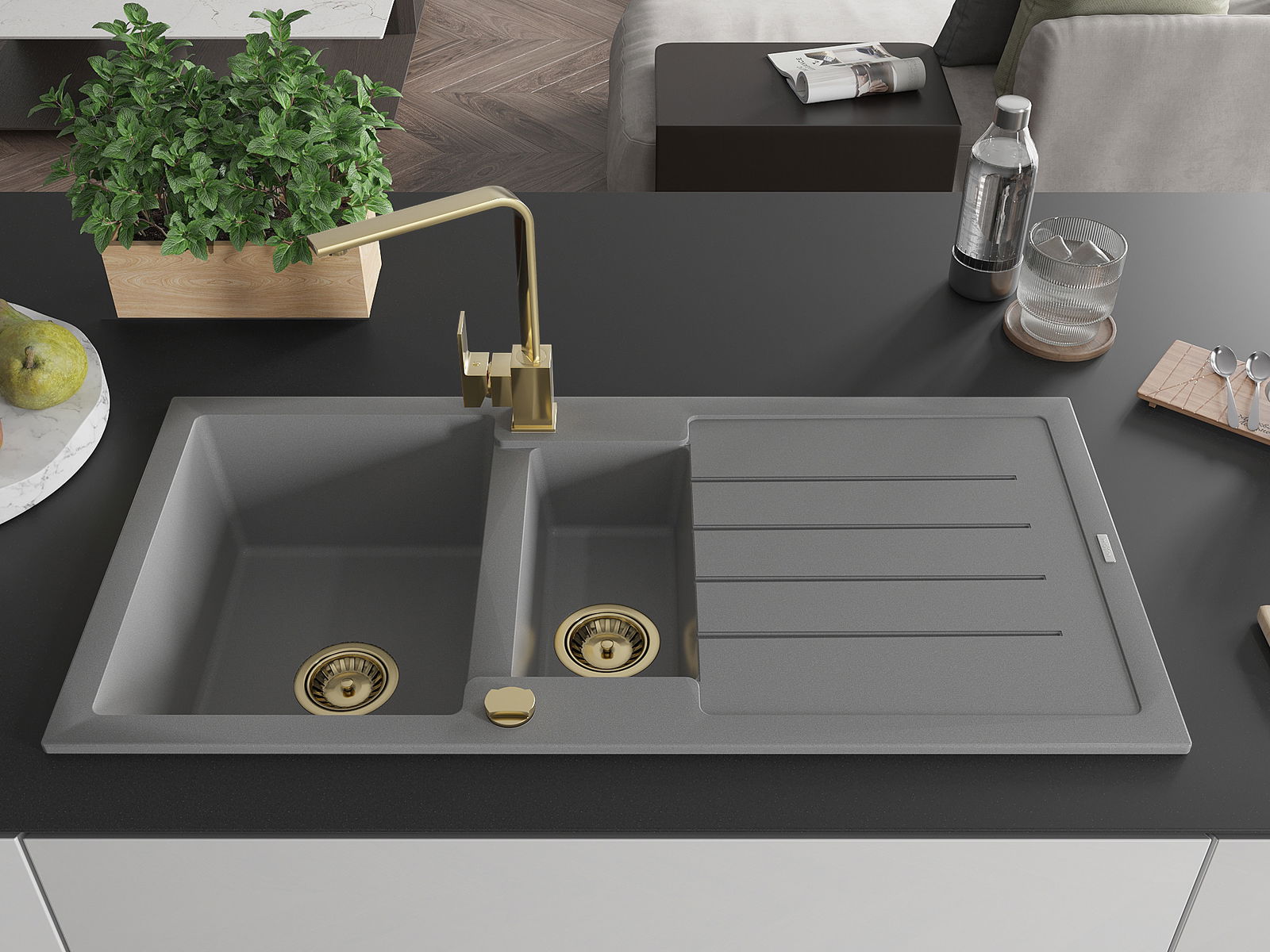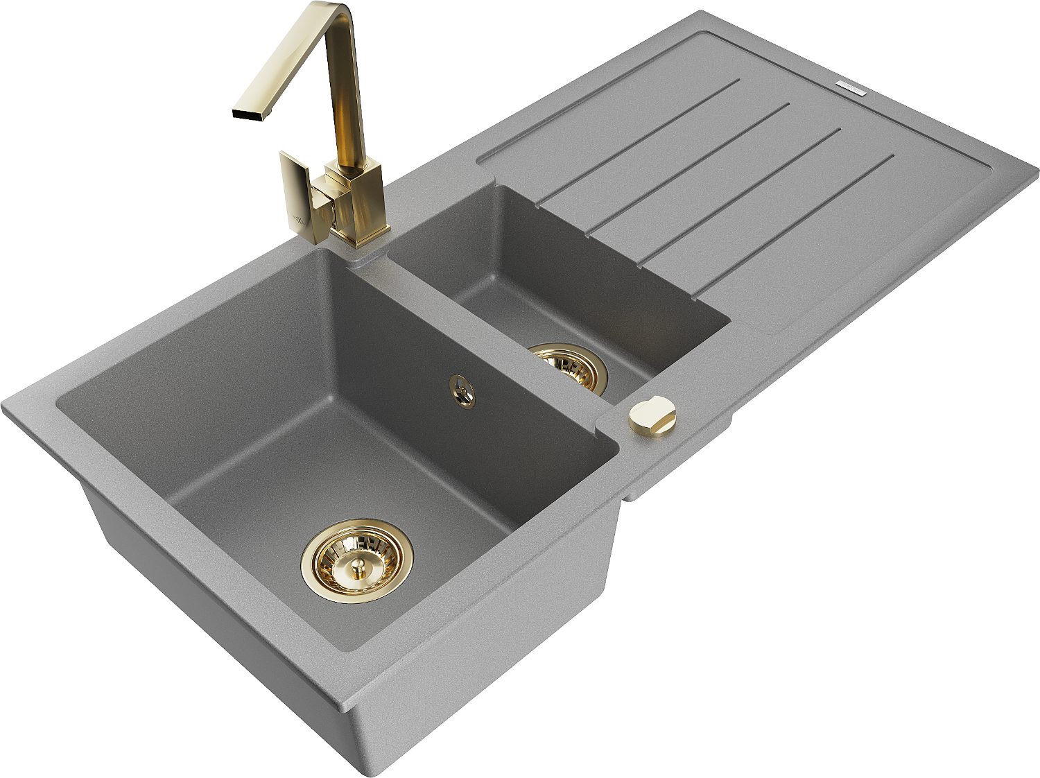 Mexen Andres chiuvetă de granit cu 1.5 cuve cu scurgător și baterie de bucătărie Rita, gri - 6515-71-670300-50