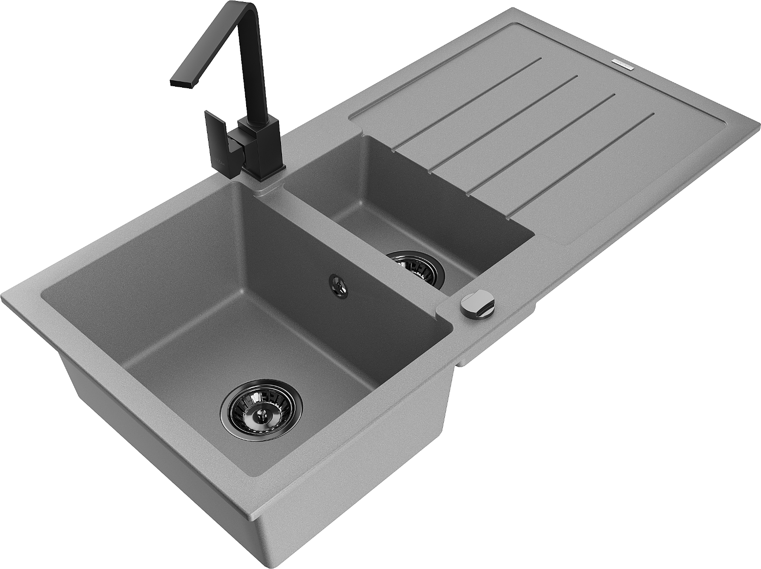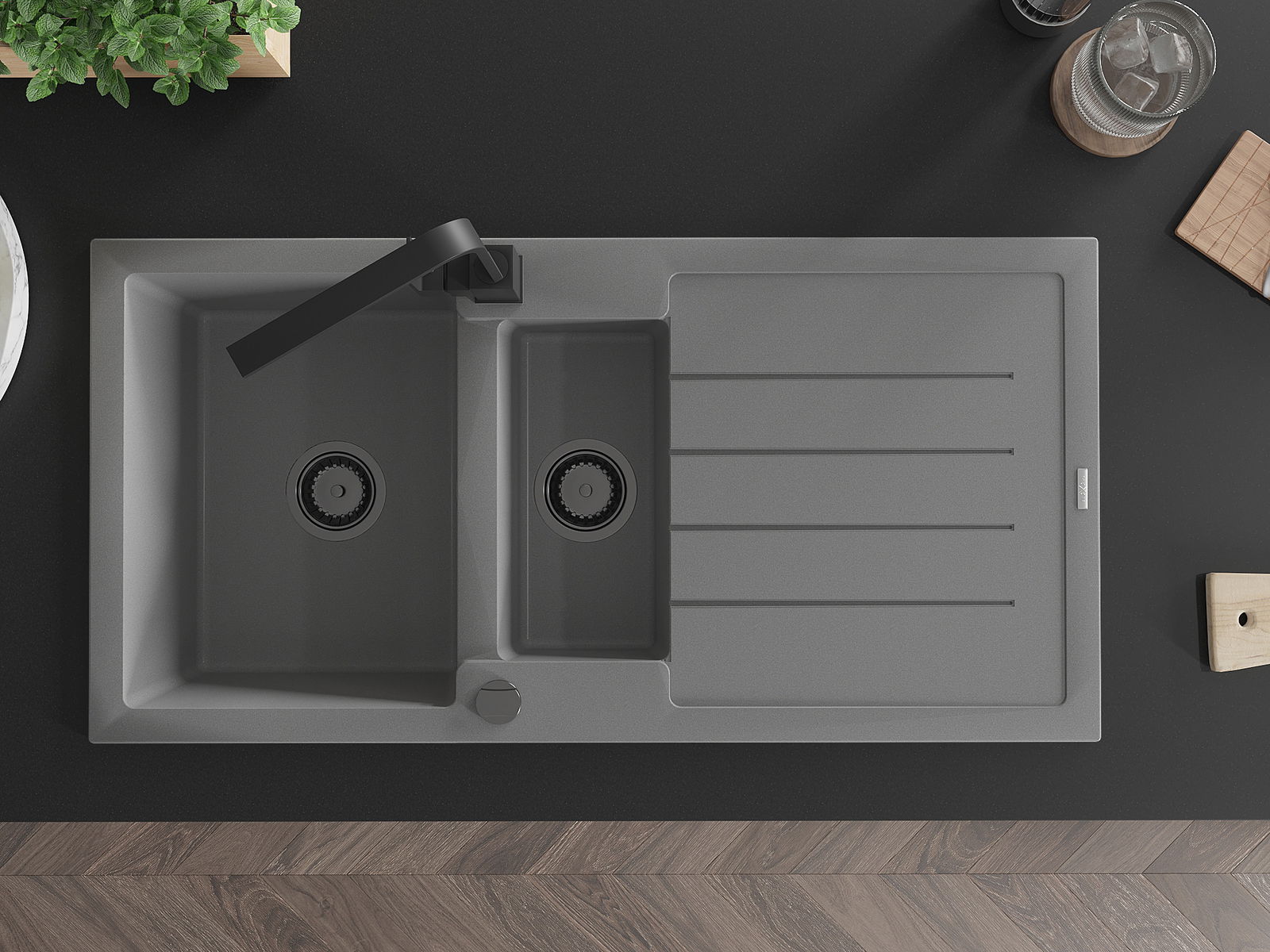 Mexen Andres chiuvetă de granit 1,5-compartiment cu scurgător și baterie de bucătărie Rita, gri - 6515-71-670300-70-B