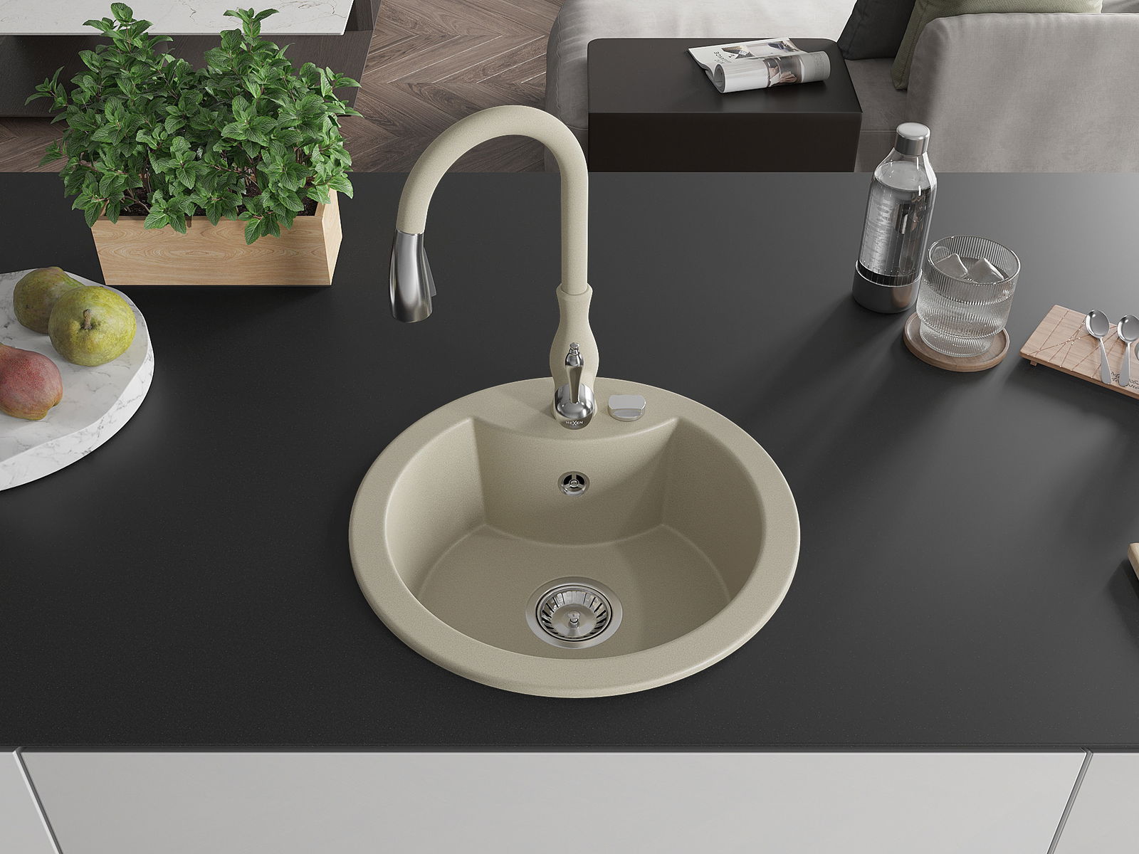 Suprafața chiuvetei este rezistentă la pete și decolorarea, datorită căreia este ușor de curățat și își păstrează culoarea mult timp. Estetică și practic completarea fiecărei bucătării.