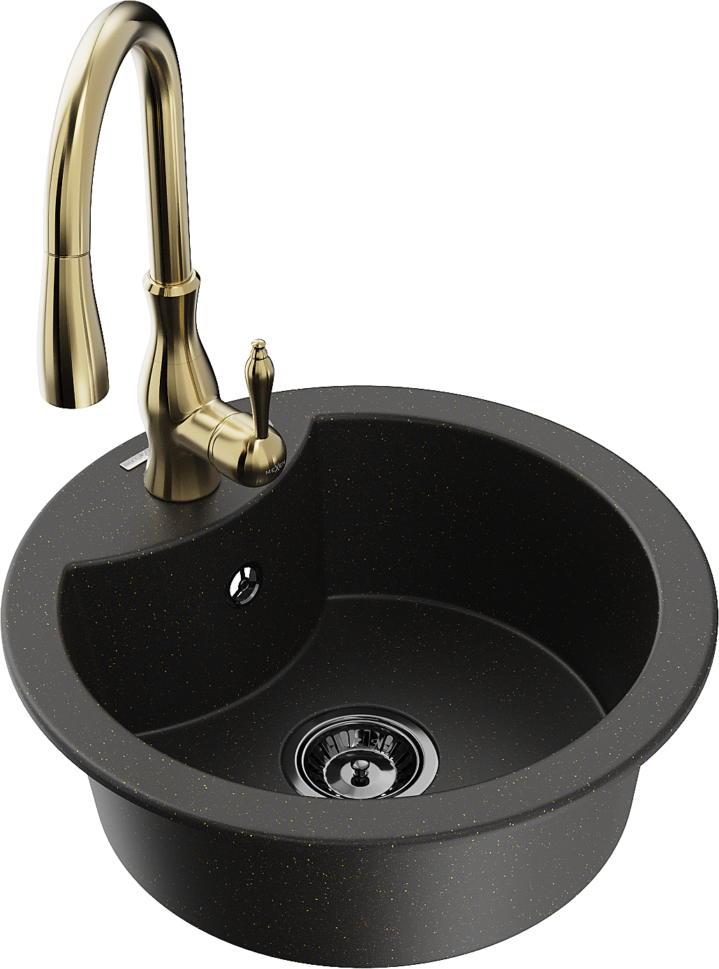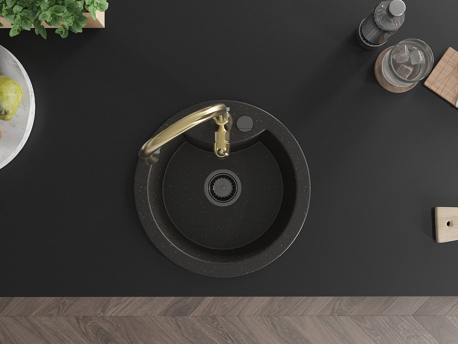 Mexen Diego chiuvetă de granit cu o cuvă și baterie de bucătărie Savita, negru/auriu metalizat - 6512-75-672601-50-B