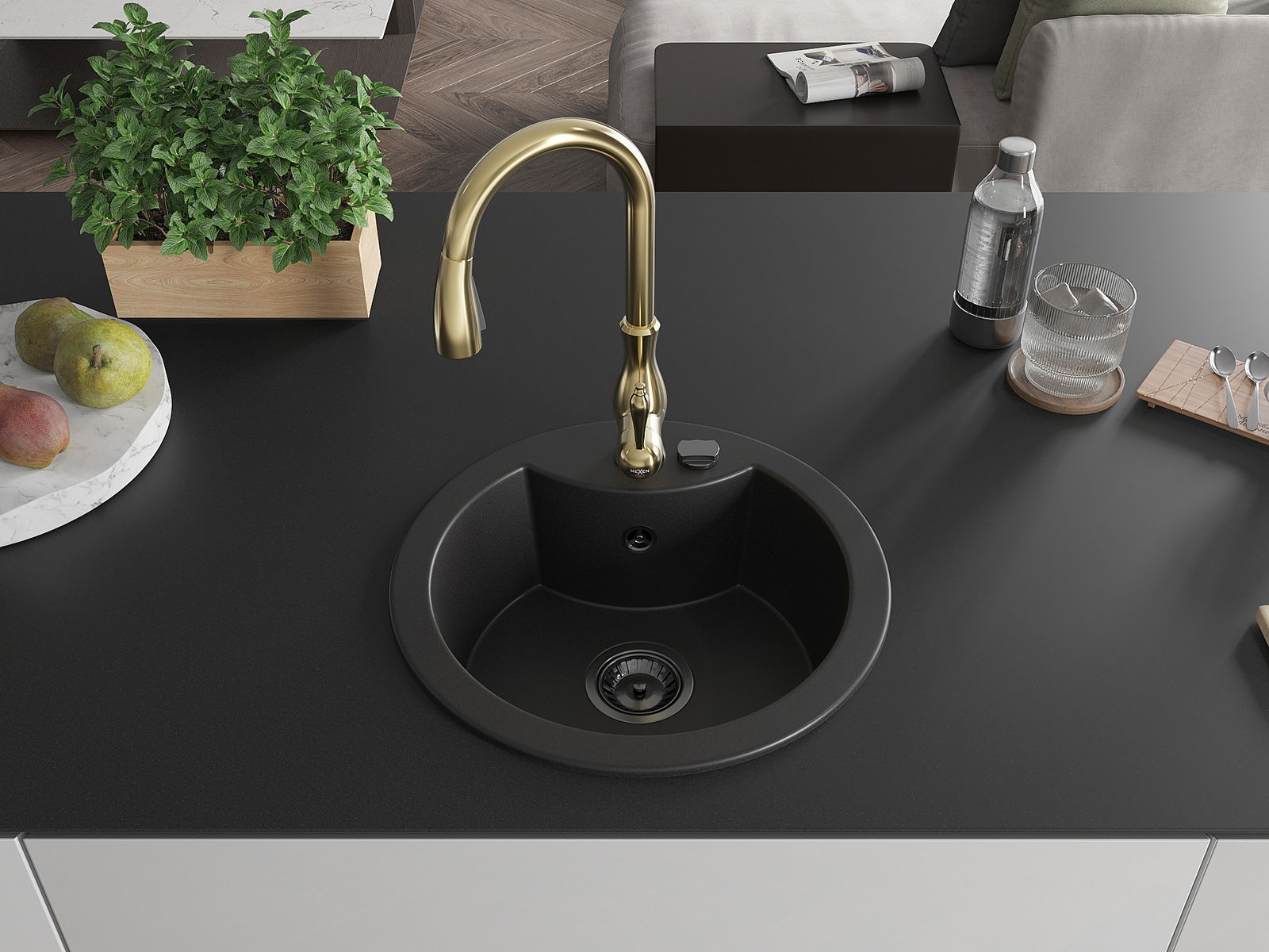 Chiuveta are o gaură prezentată cu un diametru de 35 mm pentru auto -burst. Poate fi folosit, printre altele Pentru montarea unui distribuitor de lichid care va elimina prezența sticlelor de plastic în bucătărie și îi va oferi un finisaj elegant.