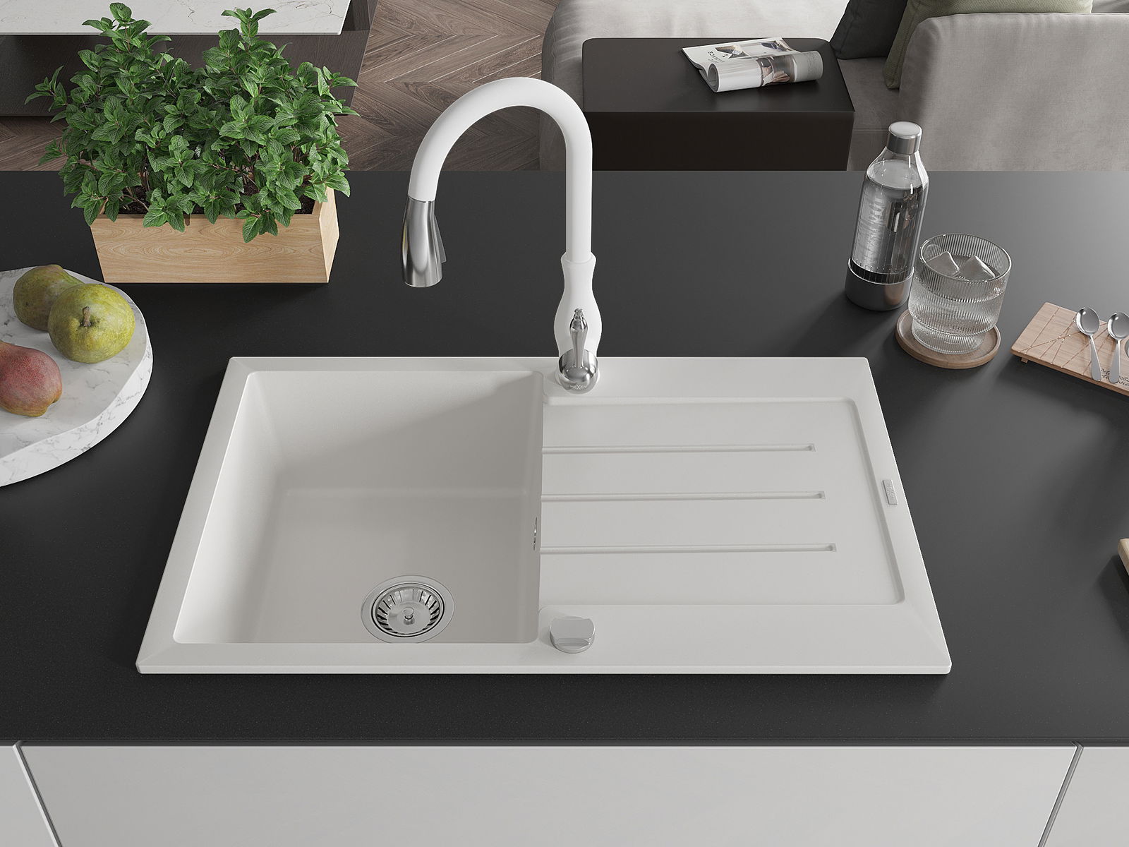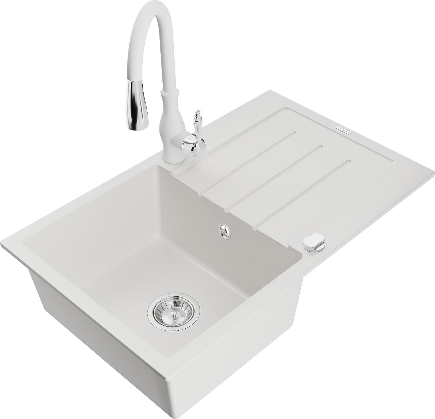 Mexen Bruno chiuvetă granit cu 1 compartiment cu picurător și baterie de bucătărie Savita, alb - 6513-20-672601-20