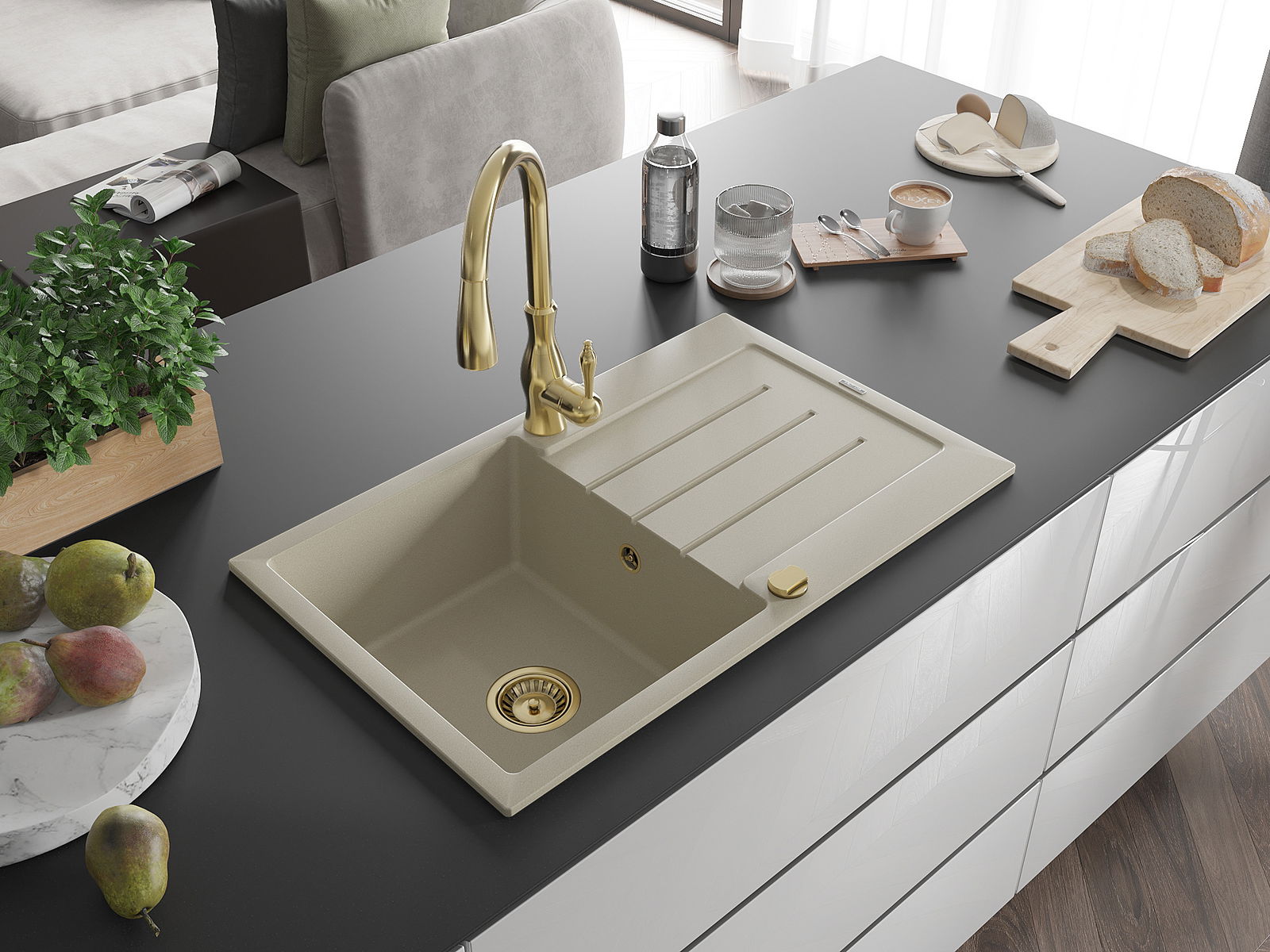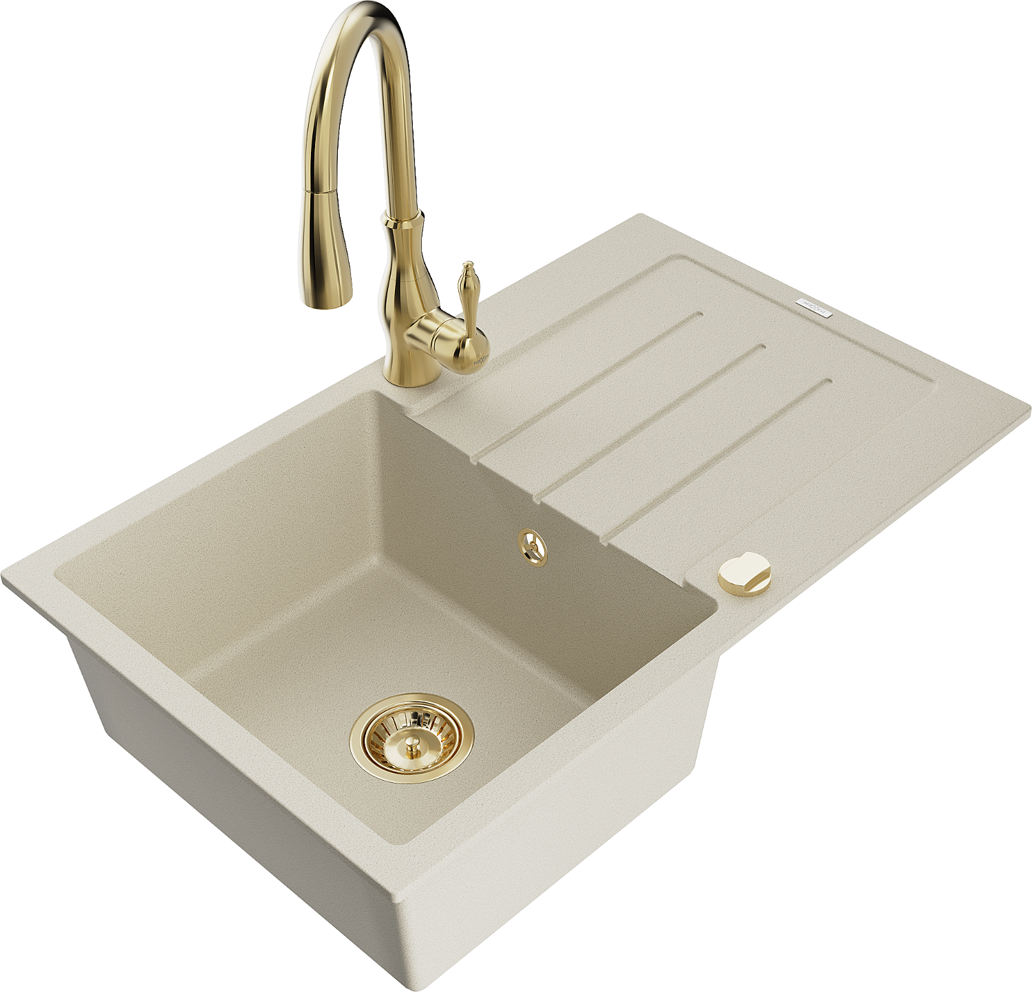 Mexen Bruno chiuvetă din granit cu 1 bazin și scurgător, cu baterie de bucătărie Savita, bej - 6513-69-672601-50