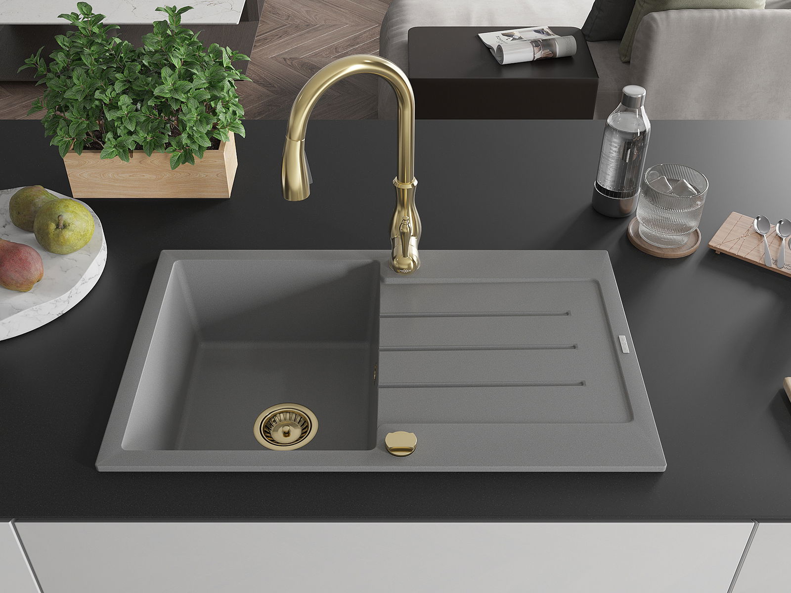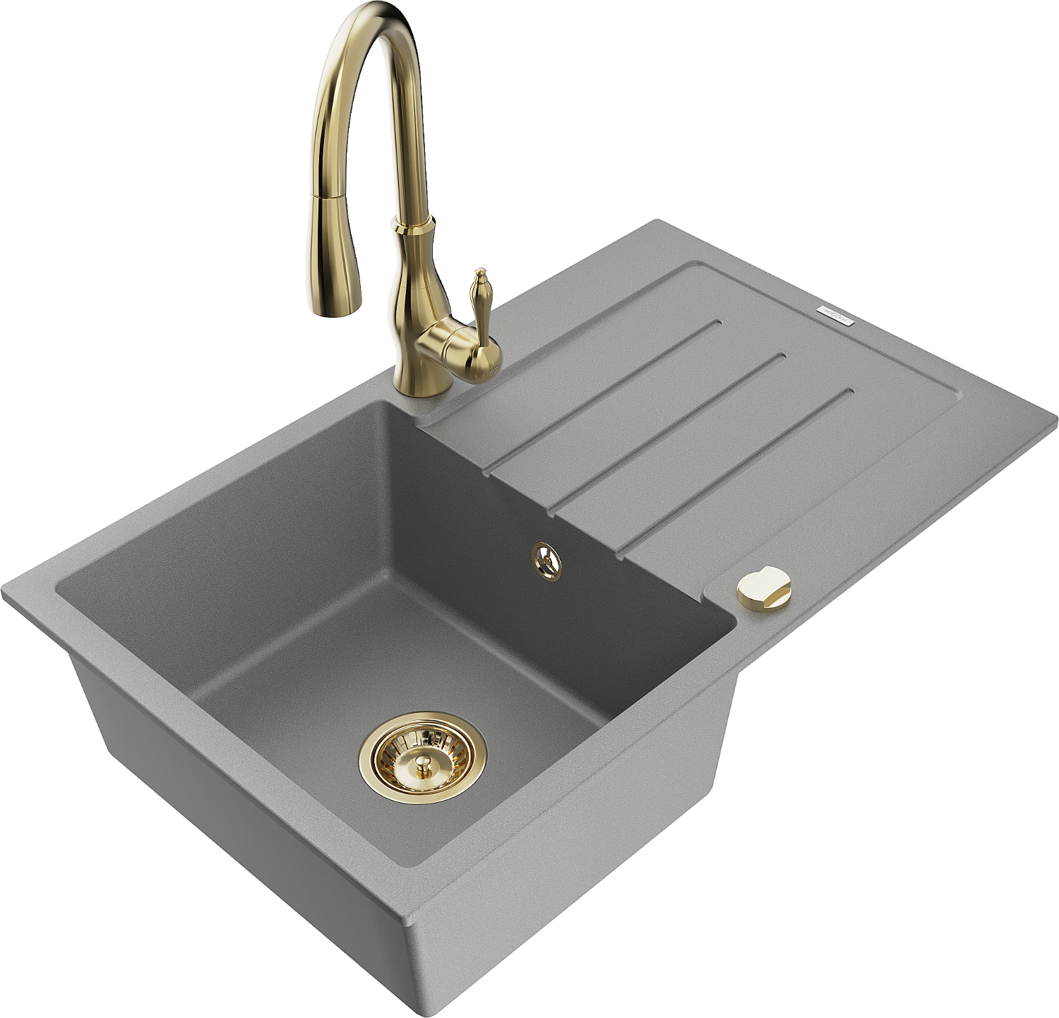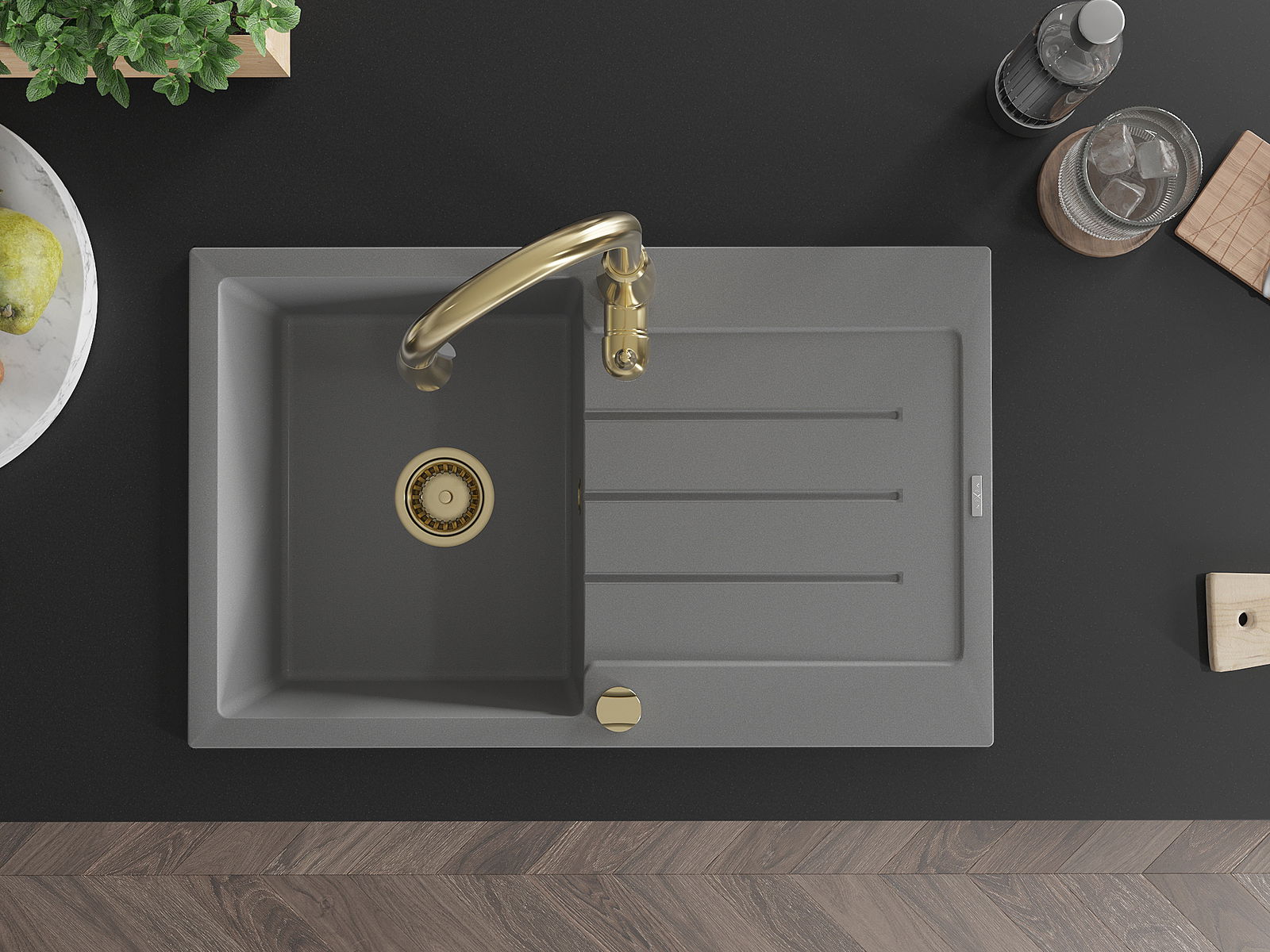 Mexen Bruno chiuvetă de bucătărie din granit, cu o singură cuvă, cu scurgător și baterie Savita, gri - 6513-71-672601-50
