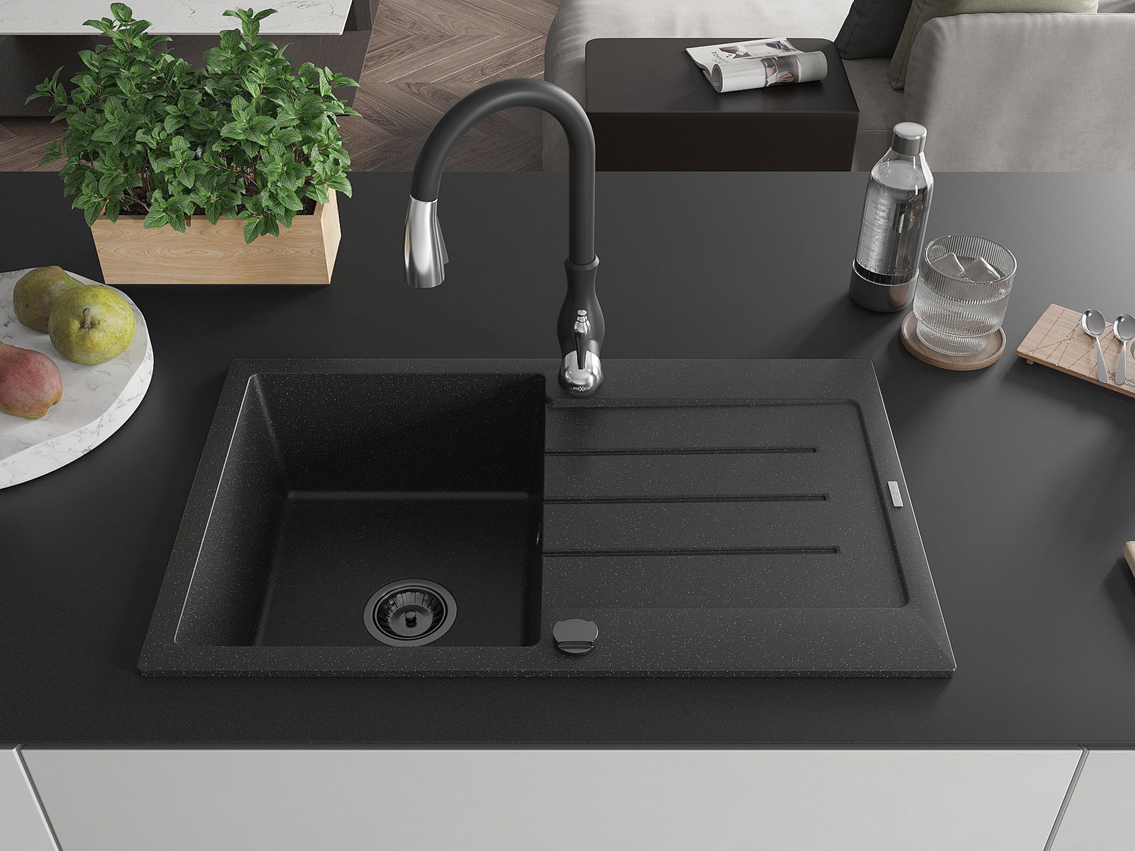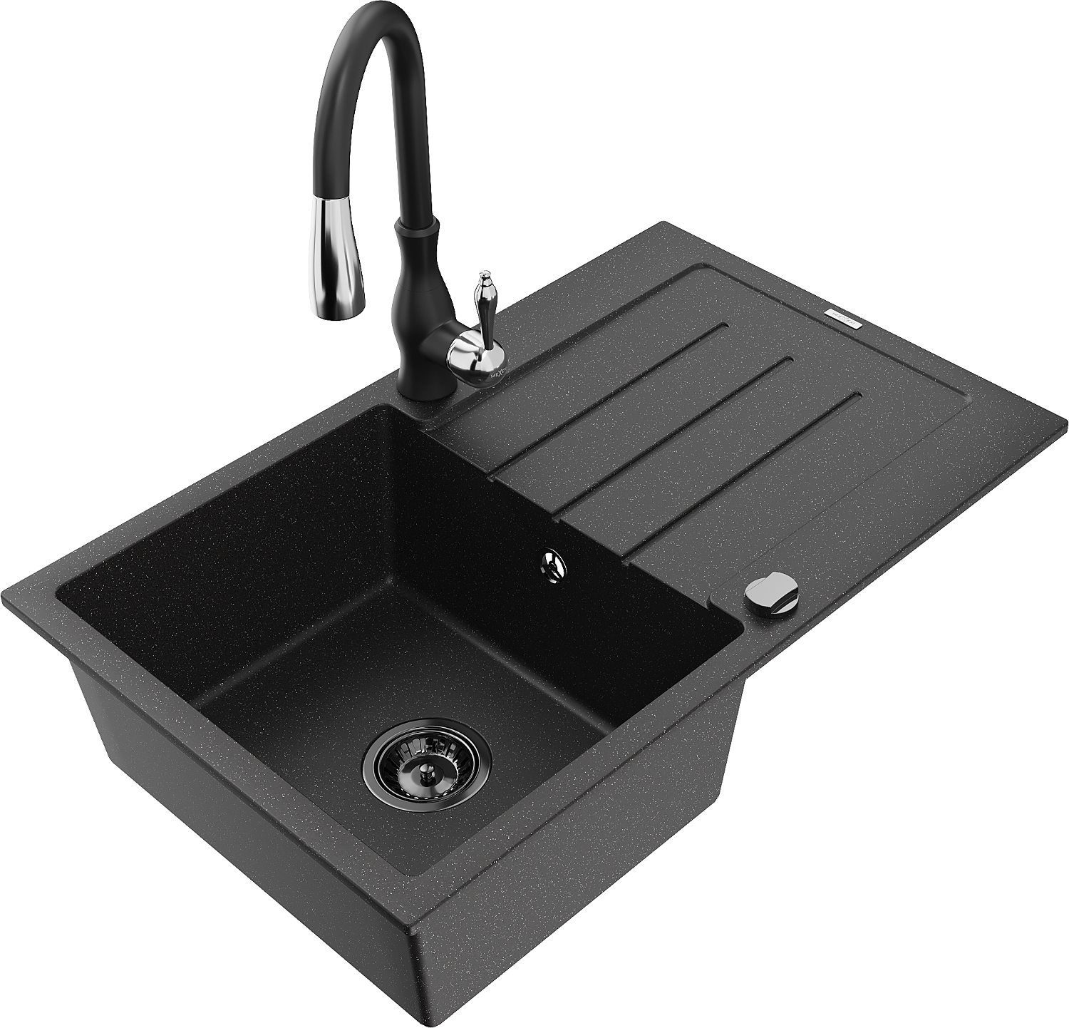 Mexen Bruno chiuveta de granit cu o cuvă, cu picurător și baterie de bucătărie Savita, negru/argintiu - 6513-73-672601-70-B