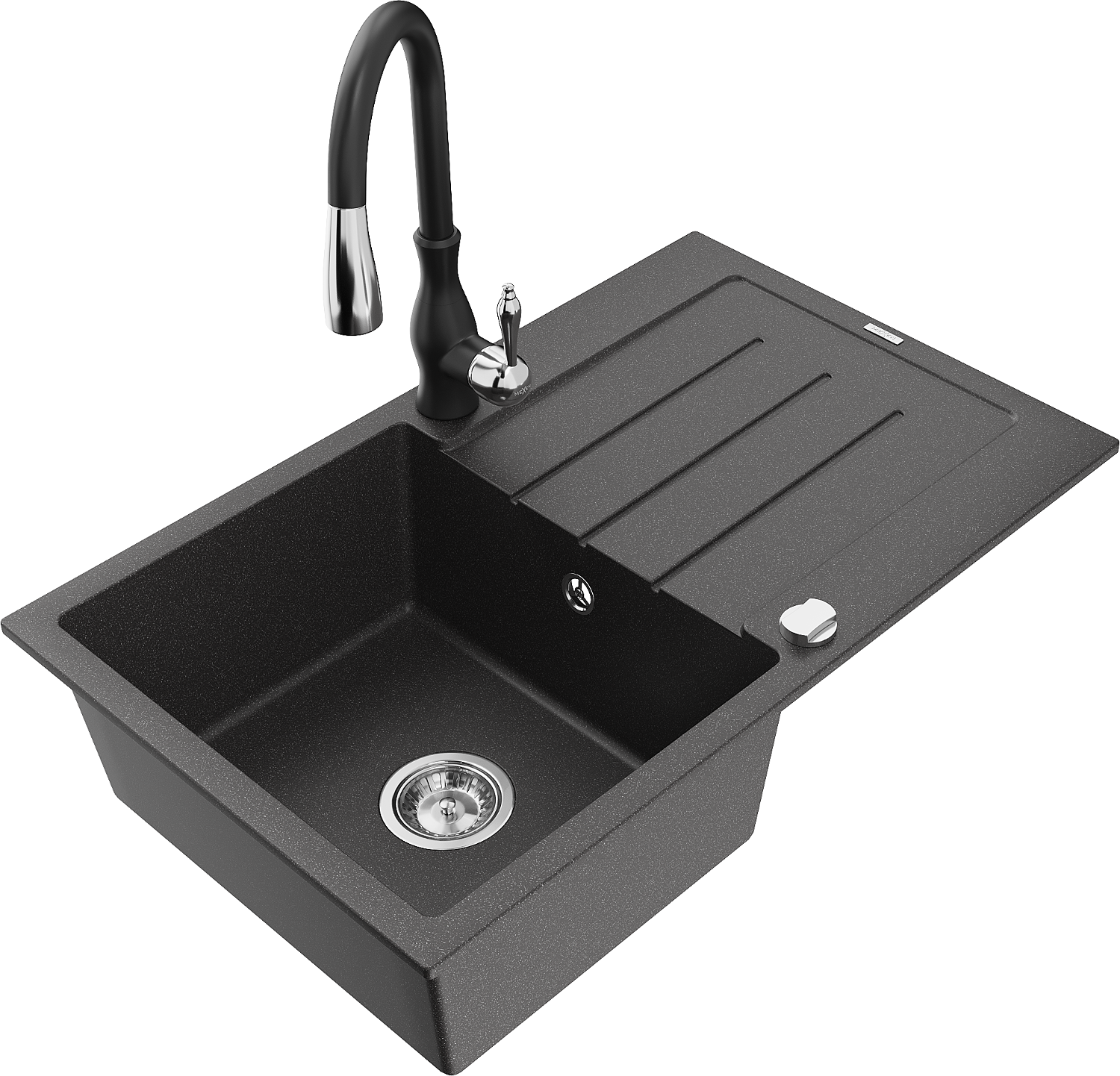 Mexen Bruno chiuvetă de granit cu o singură cuvă și picurător și robinet de bucătărie Savita, negru cu pete - 6513-76-672601-70